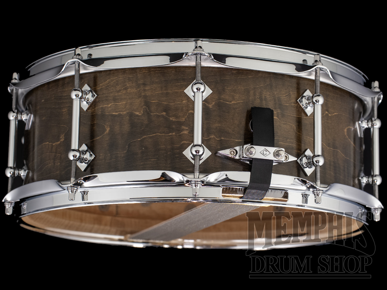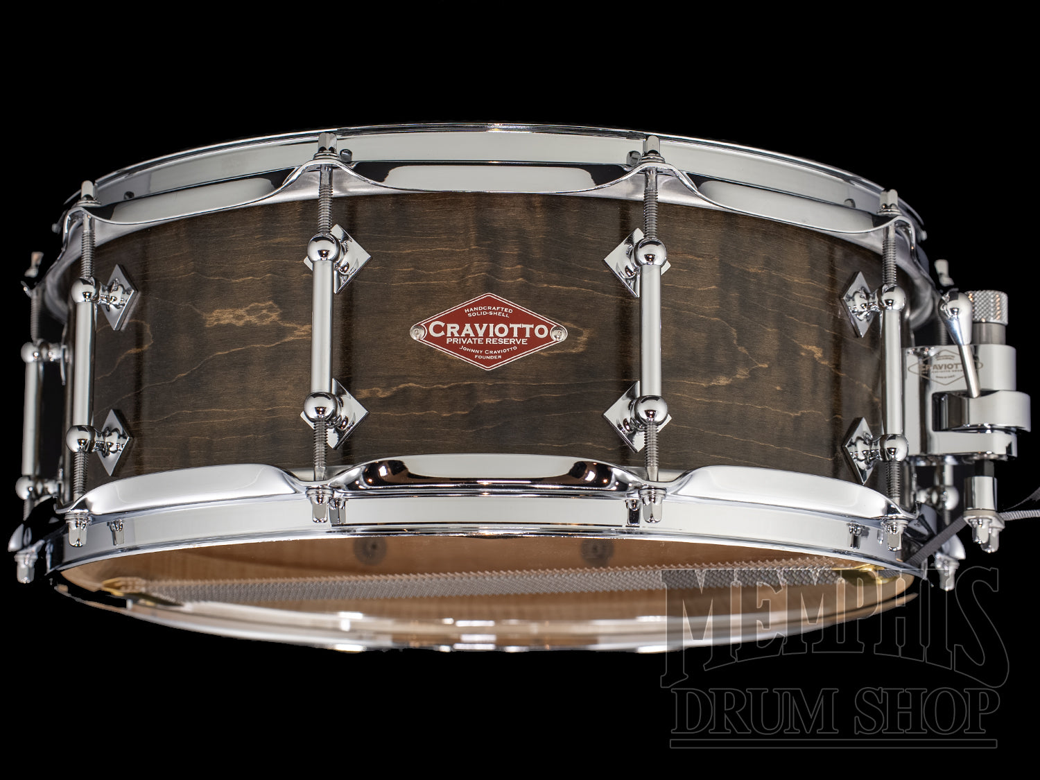 The Craviotto 14x5.5 Private Reserve Curly Maple Snare Drum - Medium Ebonized (CRPR1455CMNIME) features a Handcrafted, Solid Curly Maple Shell with Solid Curly Maple Reinforcement Hoops, 45-Degree Bearing Edges, 10 Double-Ended Tube Lugs, Triple-Flange Hoops, Trick GS007 Throw-Off, Craviotto Butt Plate, 20-Strand Snare Wires, Craviotto Logo Remo Coated Ambassador Batter Drumhead, Craviotto Logo Remo Clear Ambassador Snare Side Drumhead, Oil Finish over Medium Ebonized Curly Maple Woodgrain, Chrome Hardware, and Craviotto Private Reserve Badge. Craviotto Soft Snare Drum Bag Included with Purchase.