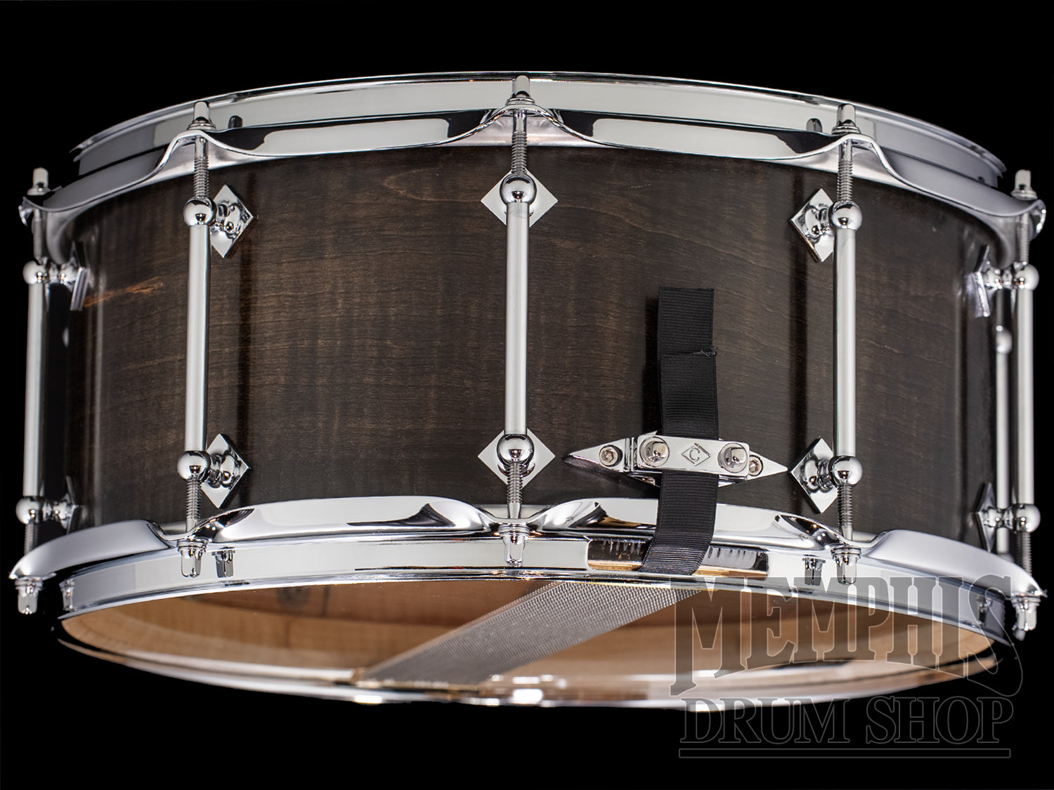 The Craviotto 14x6.5 Private Reserve Curly Maple Snare Drum - Dark Ebonized (CRPR1465CMNIDE) features a Handcrafted, Solid Curly Maple Shell with Solid Curly Maple Reinforcement Hoops, 45-Degree Bearing Edges, 10 Double-Ended Tube Lugs, Triple-Flange Hoops, Trick GS007 Throw-Off, Craviotto Butt Plate, 20-Strand Snare Wires, Craviotto Logo Remo Coated Ambassador Batter Drumhead, Craviotto Logo Remo Clear Ambassador Snare Side Drumhead, Oil Finish over Dark Ebonized Curly Maple Woodgrain, Chrome Hardware, and Craviotto Private Reserve Badge. Craviotto Soft Snare Drum Bag Included with Purchase.