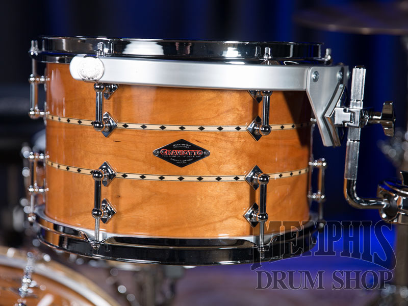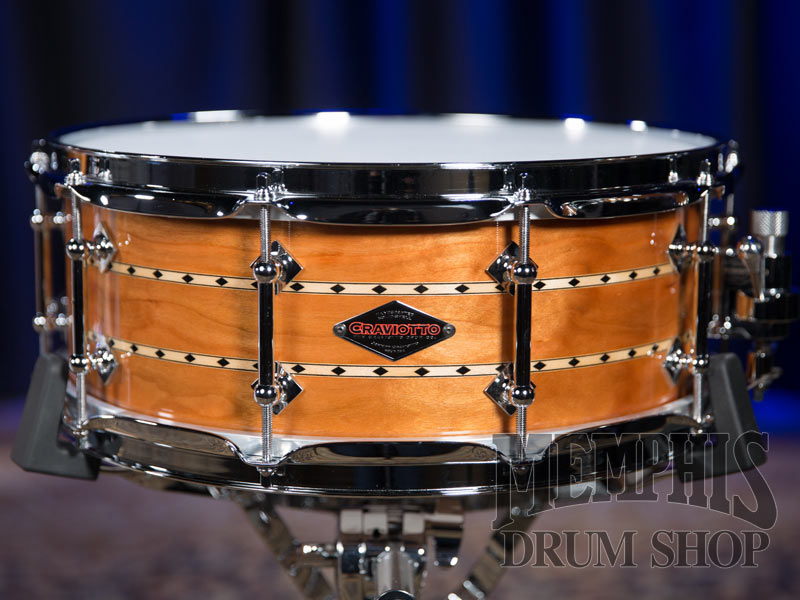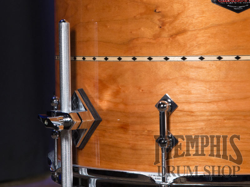The Craviotto Custom Shop Cherry Drum Set has Solid Cherry Shells with Maple Double Inlays. This Craviotto Drum Set features, 45 degree bearing edges on the toms and bass drum, The snare drum features Craviotto's Baseball Bat bearing edge on the batter side with a 45 degree bearing edge on the resonant side, Triple Flange Hoops, and Craviotto Diamond Tube Lugs. This Drum Set has a Clear Gloss Finish and Chrome Hardware