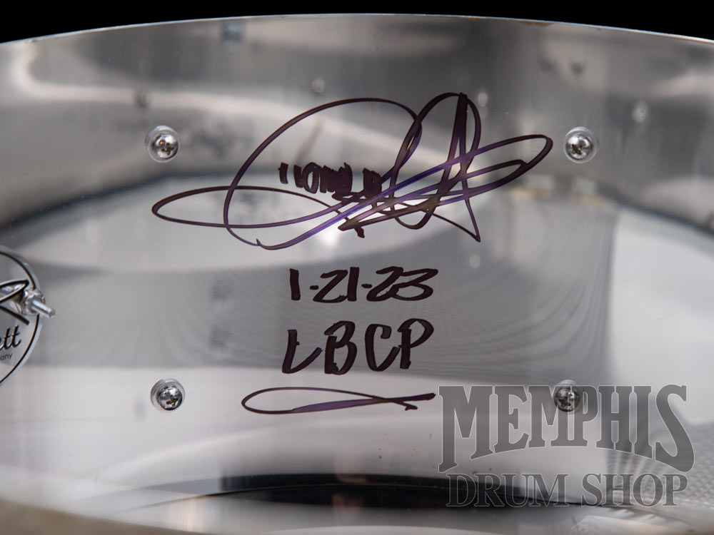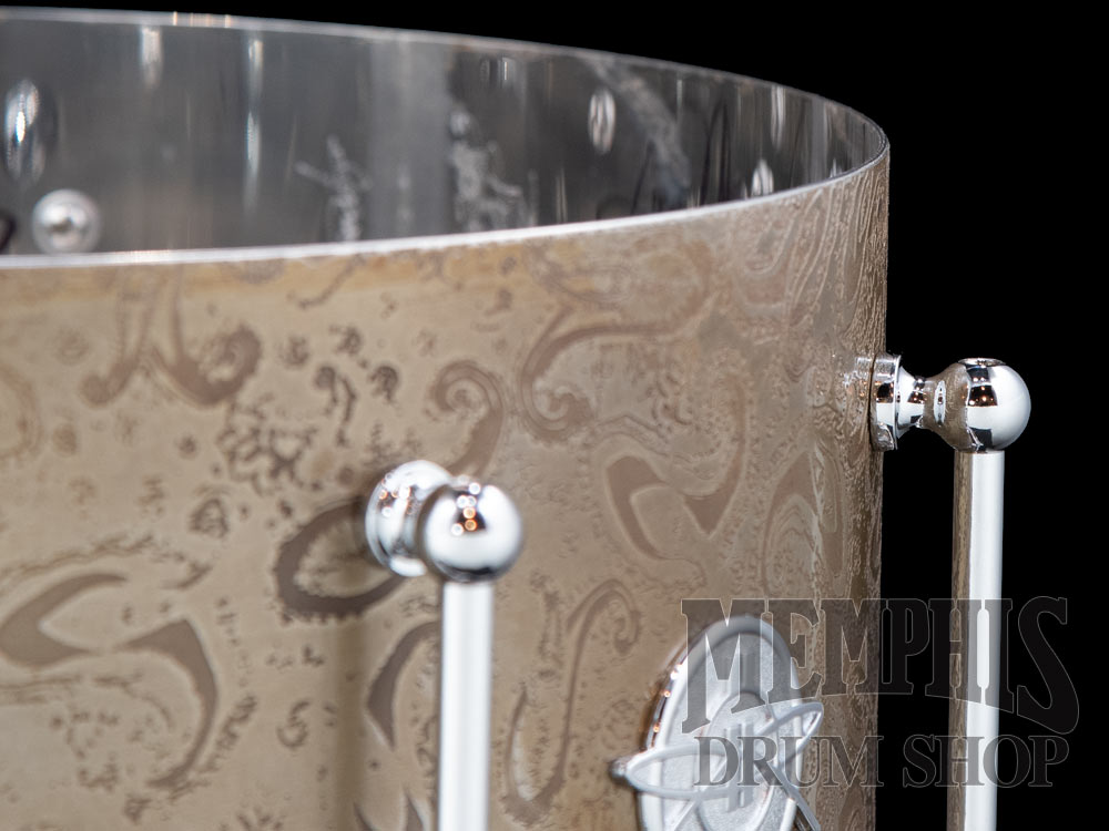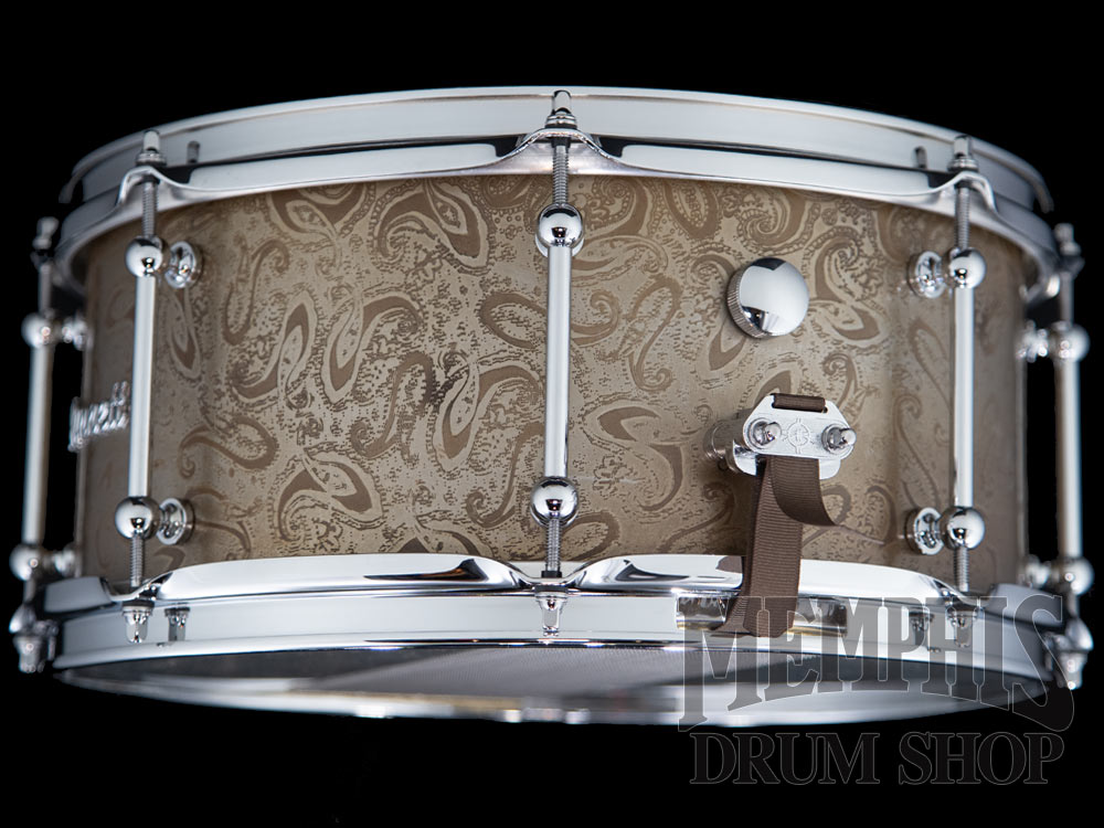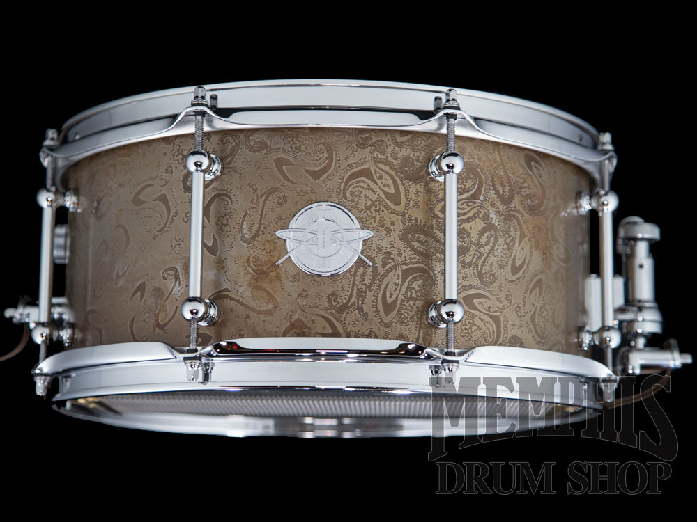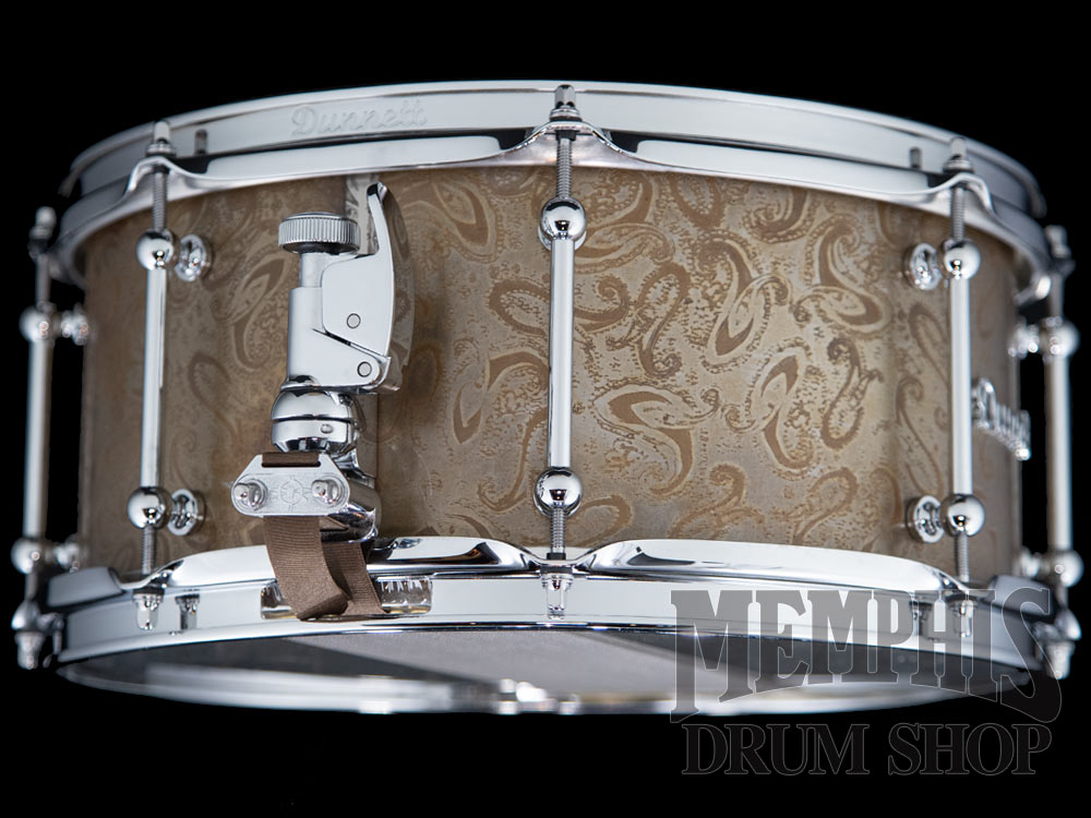 The Dunnett Classic 14x6.5 James Trussart Rust O Matic Full Paisley Steel Snare Drum (6514SS-JTP-FP) features a custom hand-etched steel shell with straight bearing edges, 8 double-ended tube lugs, Dunnett double-edge/double-flange hoops, Dunnett Hypervent, Dunnett R5 throw-off and butt plate, 42-strand snare wires, Remo Ambassador Renaissance batter drumhead, Cristal Res-O-Clear snare side drumhead by Remo, Rust O Matic Full Paisley finish, chrome hardware, and Dunnett Classic badge. Soft bag with Dunnett logo included.