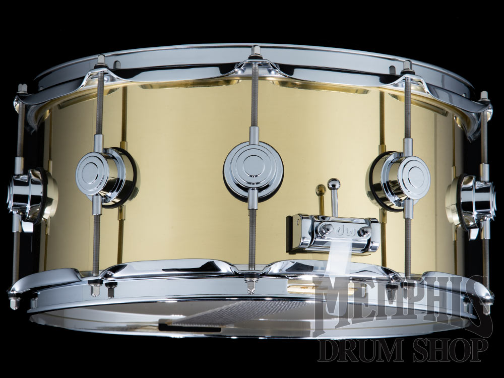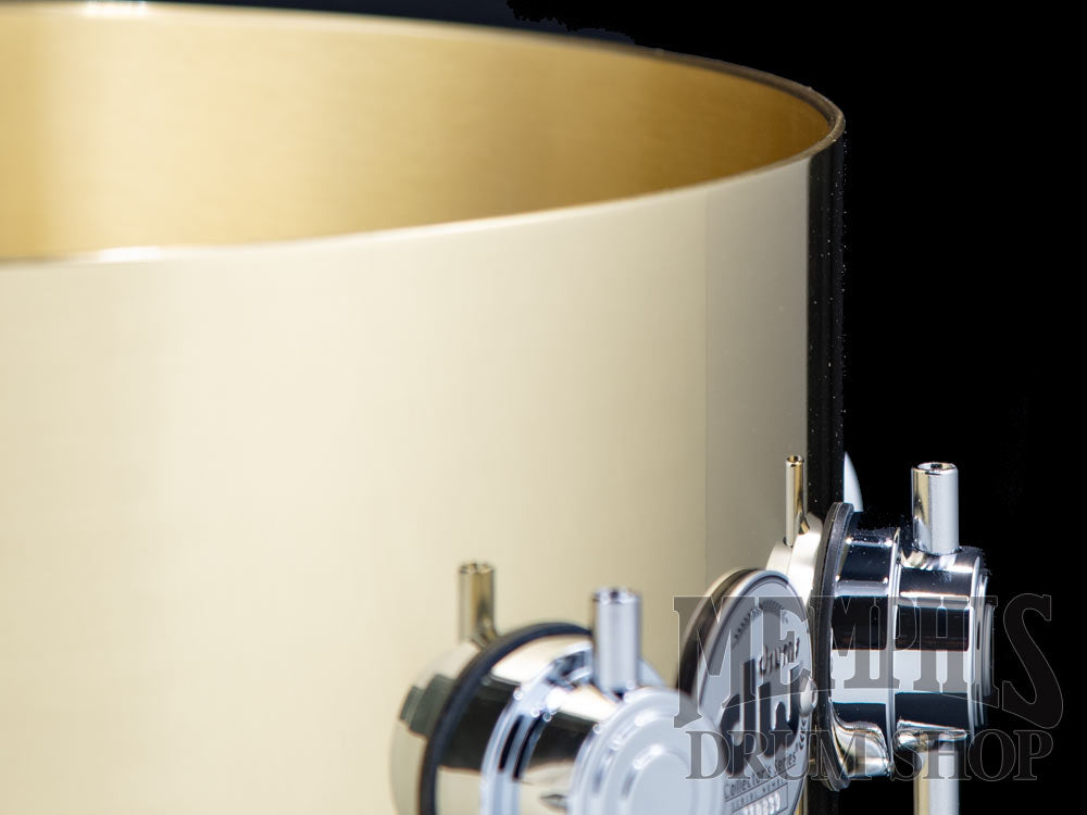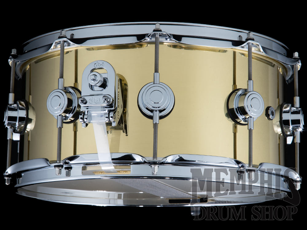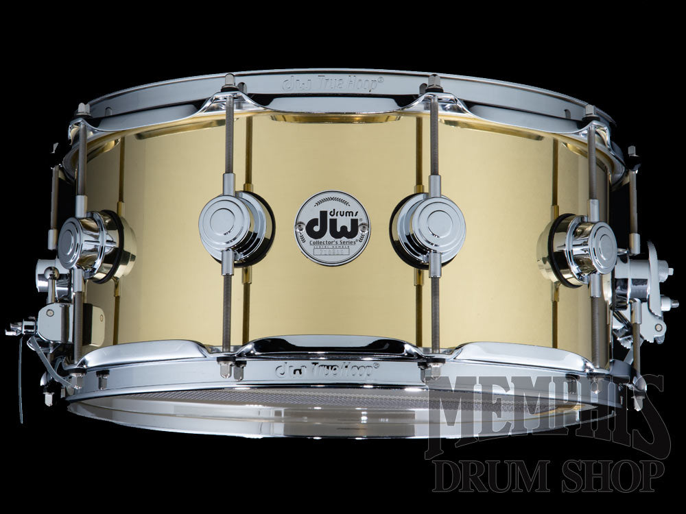 The DW 14x6.5 Collector's Series Bell Brass Snare Drum (DRVN6514SPC) features a 3mm bell brass shell with straight bearing edges, 10 double-ended Turret lugs, True-Pitch tension rods, 3.0mm True-Hoops, MAG throw-off, 5P butt plate, 20-strand True-Tone snare wires, DW Coated White Snare Batter drumhead with tuning sequence by Remo, DW Clear Snare Bottom drumhead by Remo, polished bell brass finish, chrome hardware, and DW Collector's Series badge.