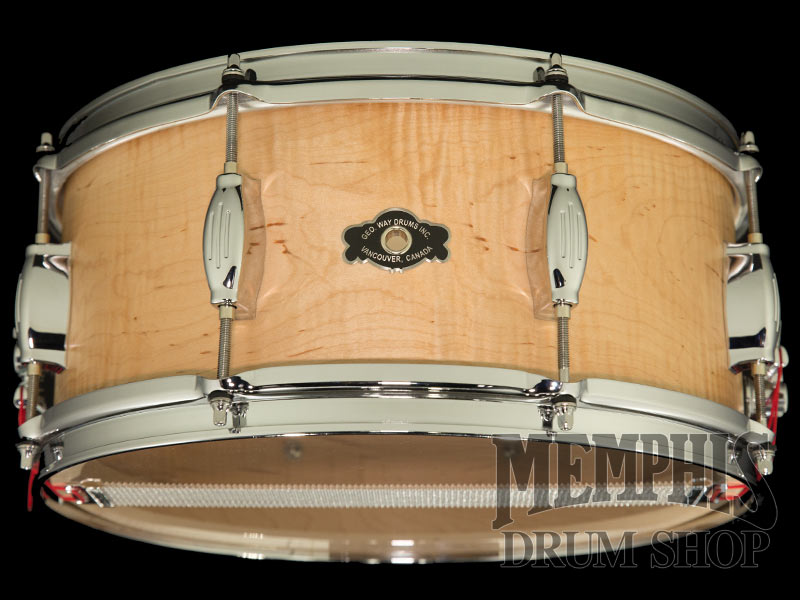 The 14x6.5 George Way Advance Flame Maple Snare Drum (GW654A-FM) has a steam-bent, solid Maple shell with Maple reinforcement hoops. This snare drum features 8 George Way Double-Ended Streamline lugs, Double Edge-Double Flange hoops, 20-strand snare wires, 845 Throw Off and Butt-End Adjuster, 30-Degree Bearing Edges, AAA Chrome Plating on all metal parts, and a George H. Way logo coated Ambassador drumhead by Remo. This snare drum has a maple woodgrain with a natural satin finish, and chrome hardware.