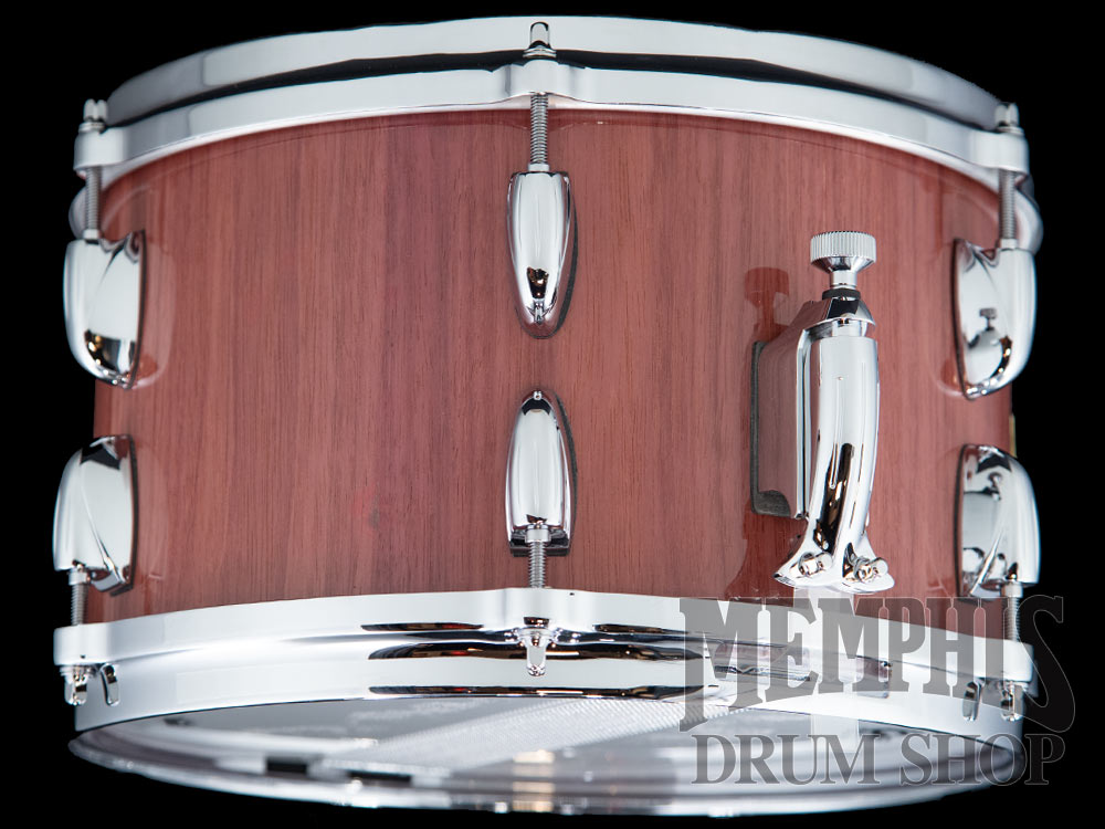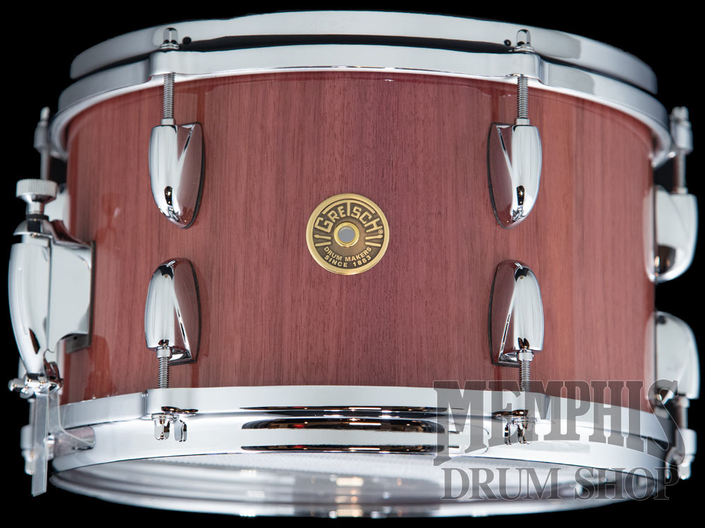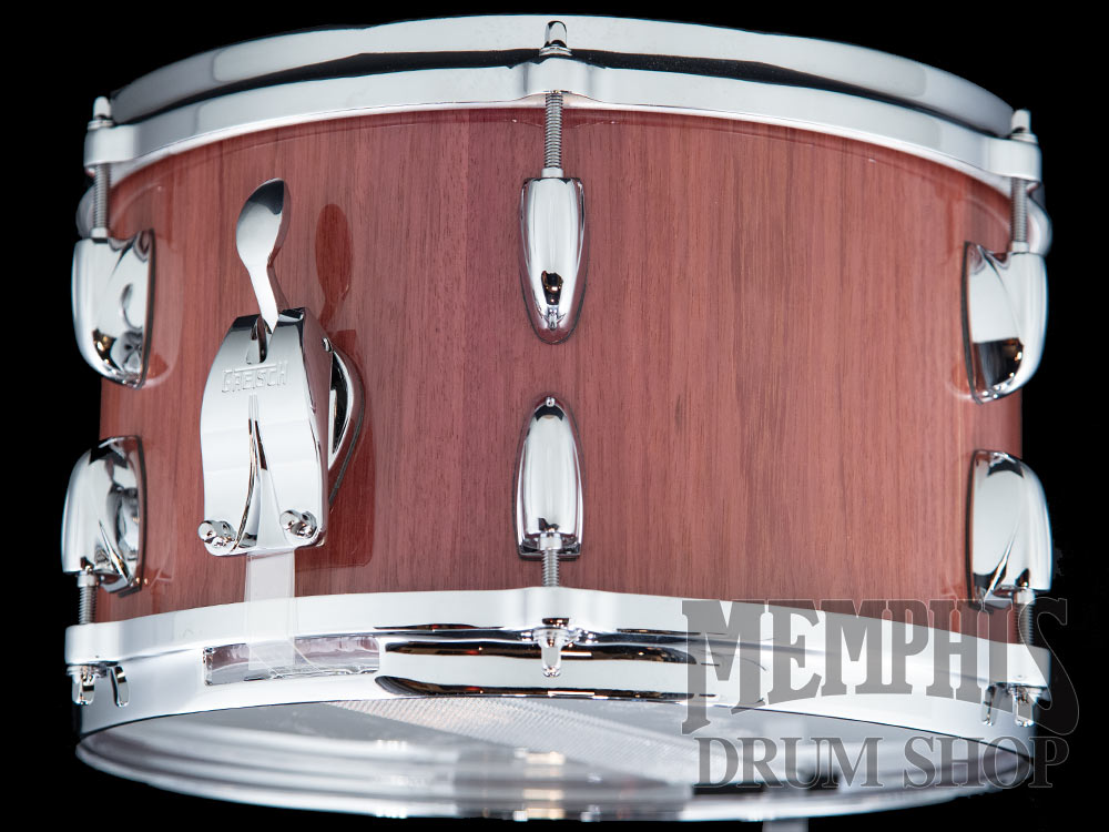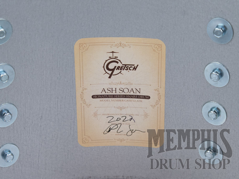 The Gretsch 12x7 USA Custom Ash Soan Signature Snare Drum (GAS0712-ASH) features a 9-ply purpleheart shell with 45/45 degree bearing edges, 12 single-ended lugs (6-lug configuration), 4mm die-cast hoops, Lightning throw-off and butt plate, 20-strand snare wires, Gretsch Permatone drumheads by Remo, Clear Gloss Lacquer finish over purpleheart woodgrain, Silver Seal interior, chrome hardware, and Gretsch round badge. Each snare has an inside identification label specifying the year of production and is signed by Ash Soan.