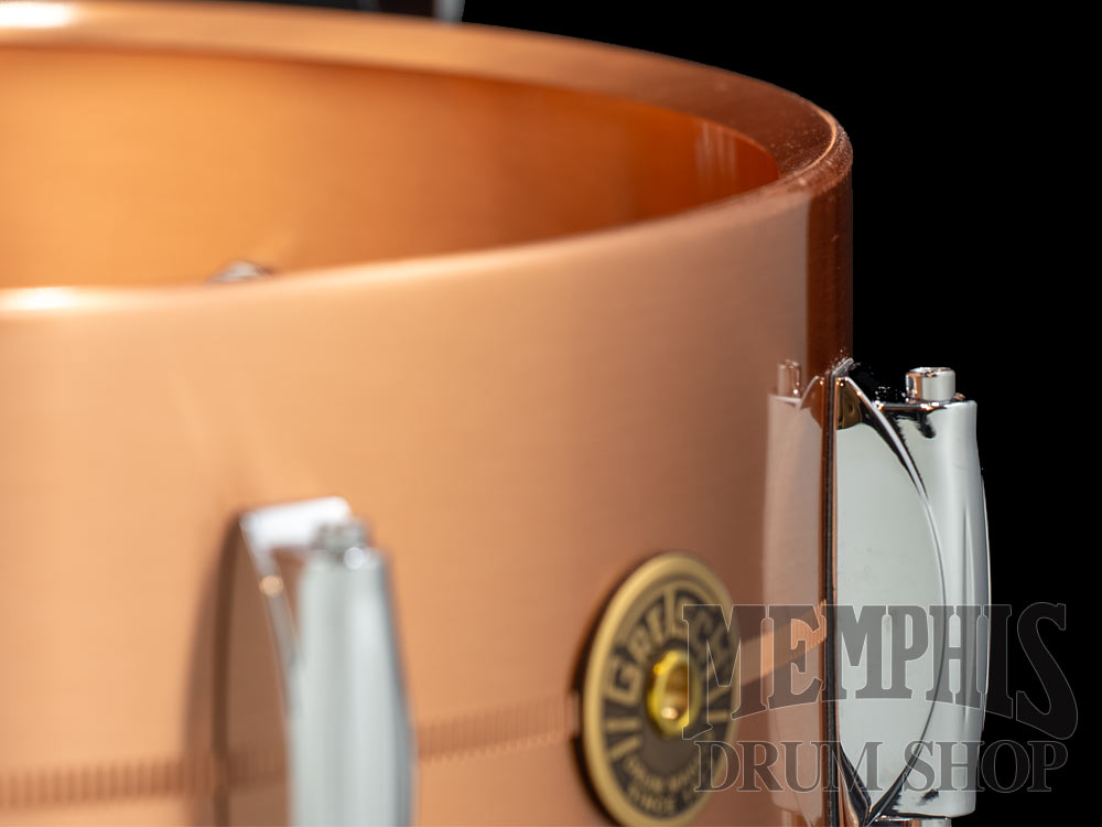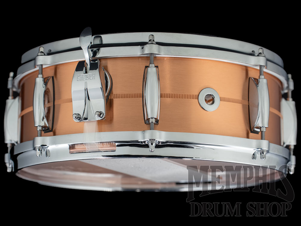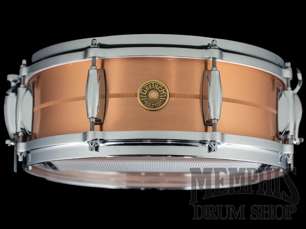 Gretsch 14x5 USA Custom Copper Snare Drum (G4160C2) - Copper snare drums musicality and beautiful appearance have been a popular choice for drummers and percussionists for many years and Gretsch’s 2mm Copper Snare falls right into this category. This snare’s thicker shell and complex character offers the ideal combination of compact feel and dynamics with a wealth of sound that any drummer would approve of. If it’s played as a rimshot, center-head, or cross stick, this copper snare really projects regardless of the volume level you play. Additional features include 45-Degree Bearing Edges, 8 Lugs, 4mm Die-Cast Hoops, Lightning Throw-Off, Adjustable Butt Plate, 42-Strand Snare Wires, Snap-In Key Holder, Polished Finish, Chrome Hardware, and Gretsch Round Badge.