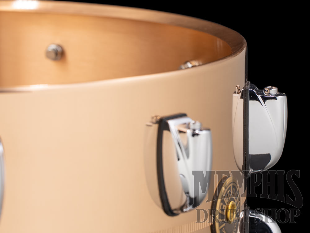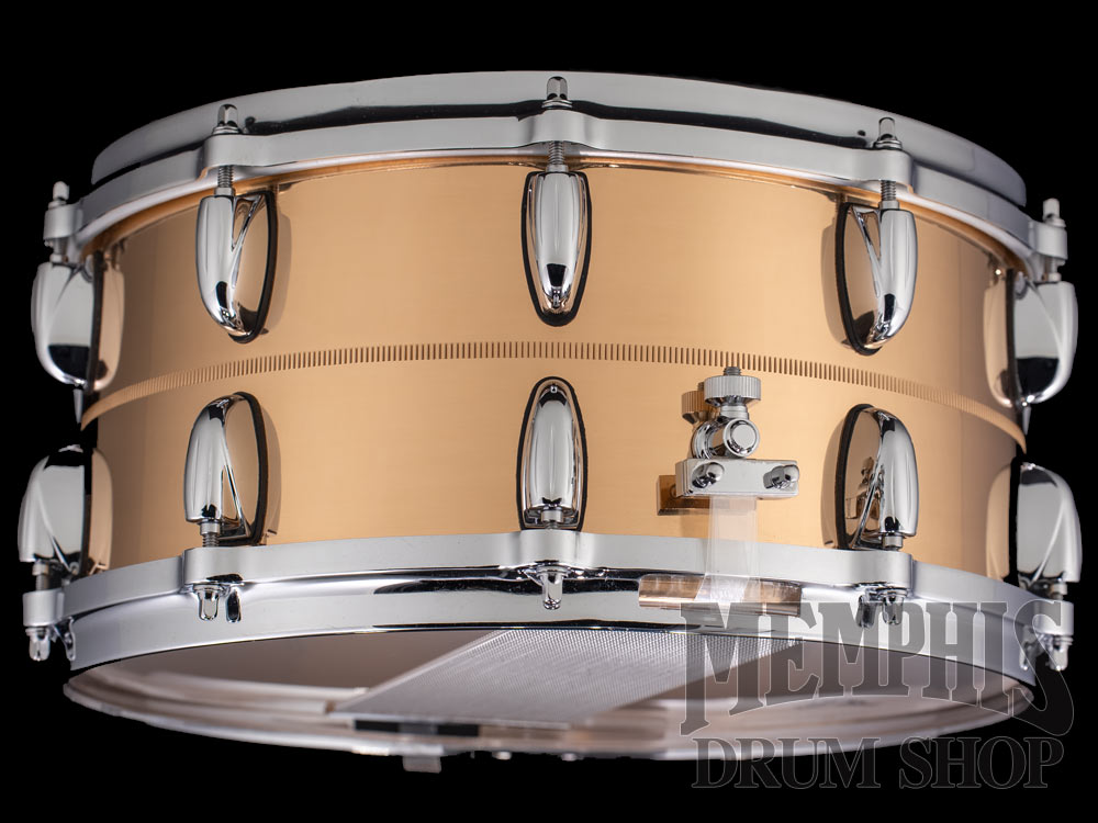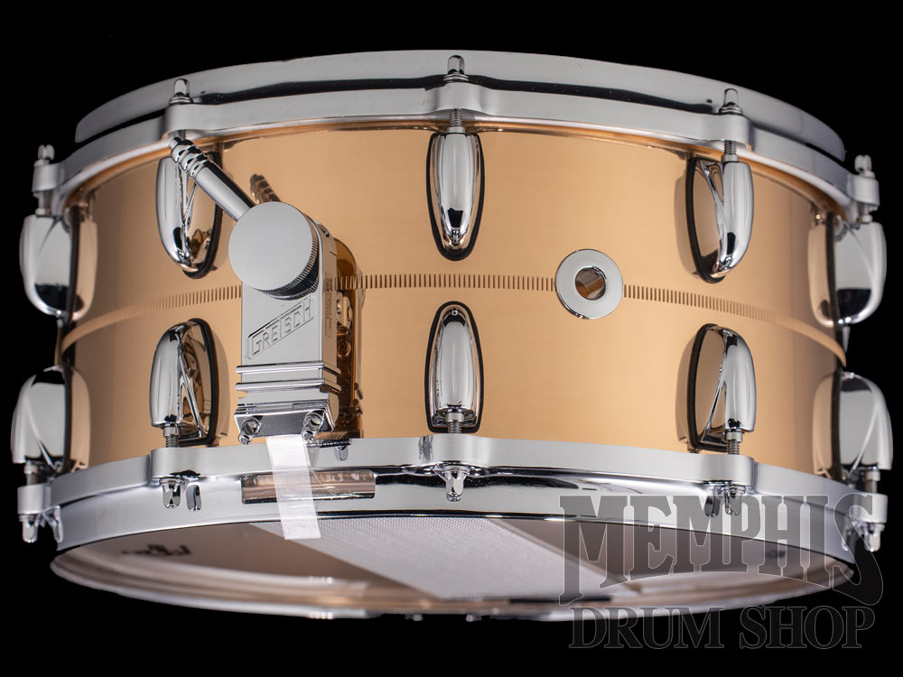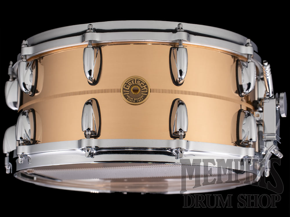 The Gretsch 14x6.5 USA Custom Bronze Snare Drum (G4169B) features a 1mm bronze shell with center knurled stripe, 45-degree bearing edges, 20 single-ended Lugs in a 10-Lug configuration, 4mm die-cast hoops, Micro-Sensitive throw-off, Snap-In key holder, 42-strand snare wires, Gretsch Permatone drumheads, polished bronze finish, chrome hardware, and Gretsch Round Badge. Sonically between a brass and copper shell, bronze is a very musical metal, as shown by its use in cymbal making for years. Bronze snares are somewhat darker than their brass counterparts, but still have a clear, defined high end and great stick articulation.