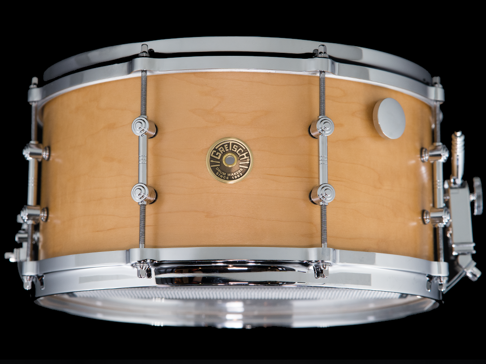 The 14x7 Gretsch USA Custom Maple Snare Drum has a 6-ply Maple/Gum shell. This Gretsch snare drum has 8 Micro Tube Lugs, 30/30 Degree Bearing Edges, Die-Cast hoops, Micro-Sensitive throw-off, 20-strand snare wires, Tone Control, Snap-In Key Holder, and Gretsch Coated Permatone drumhead by Remo. This snare drum has a Maple woodgrain with a Natural Satin finish, and a Gretsch Round Badge.
