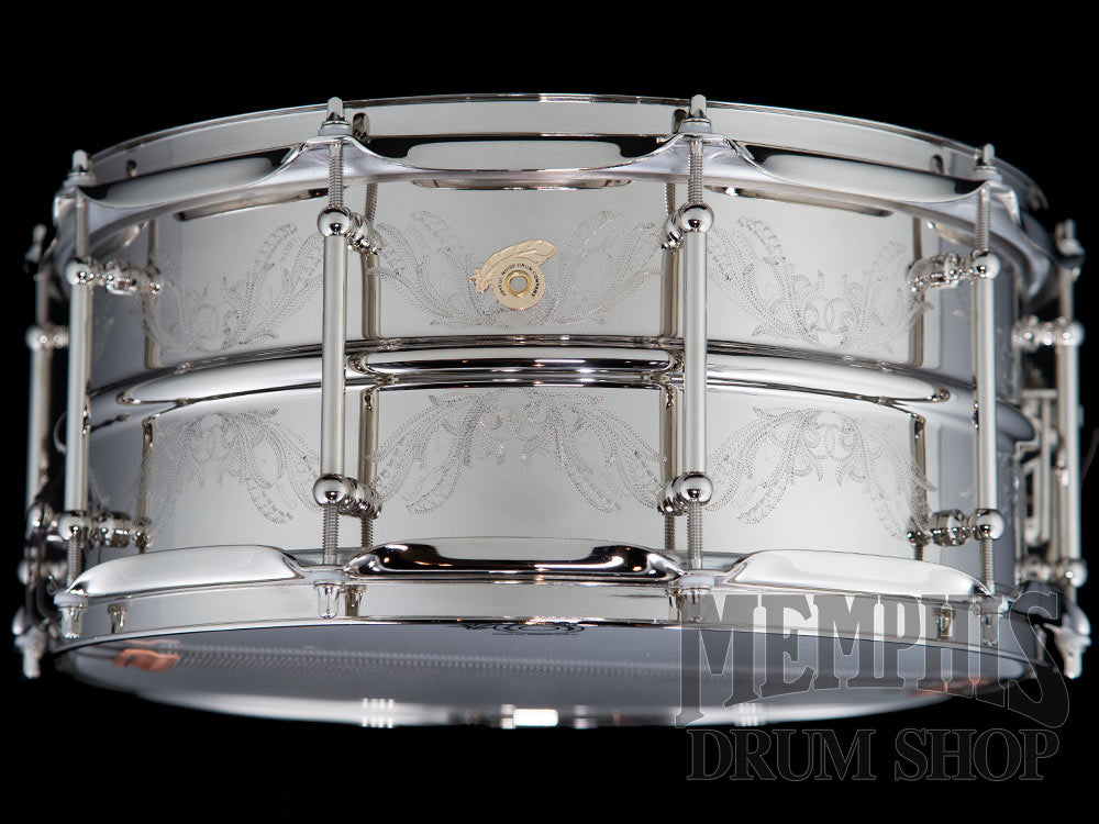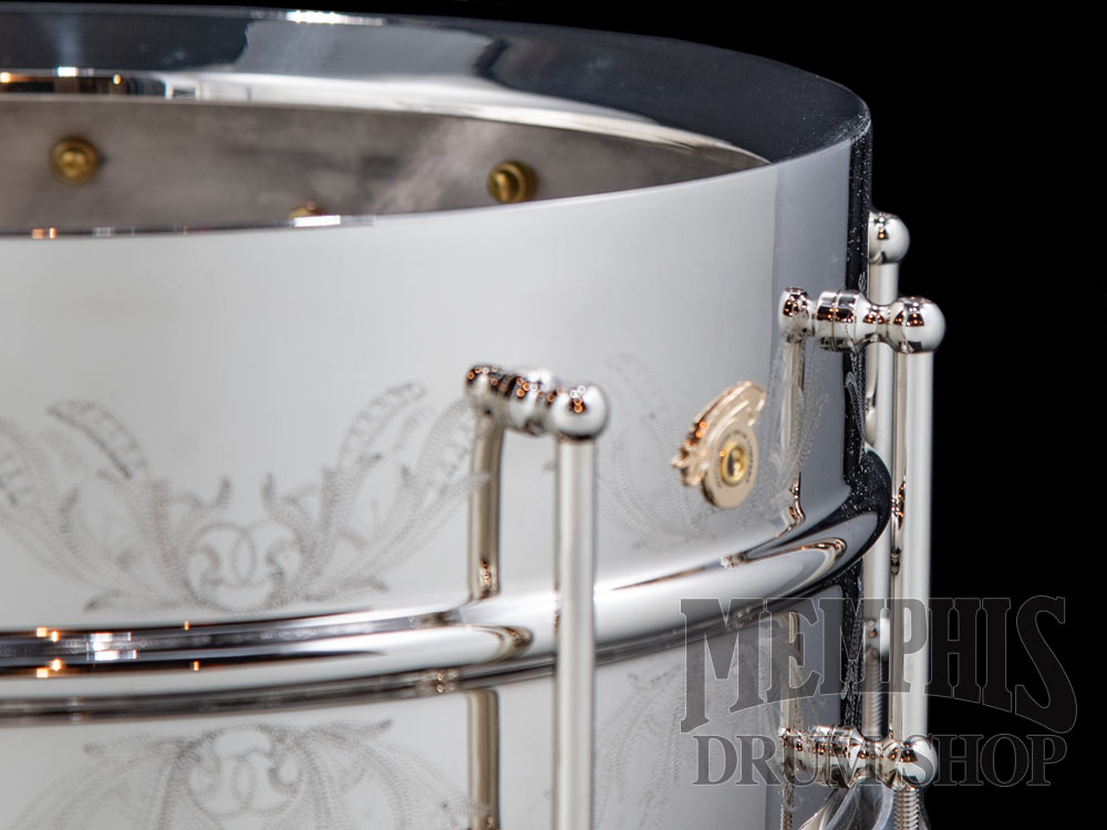 The Joyful Noise 14x6.5 Bronze Snare Drum with Lilly Of The Valley Engraving (AC-NG-LV-6514) features a Thin,Seamless Bronze Shell with 45 Degree Bearing Edges, 10 Tube Lugs, 2.5mm Solid Brass Bright Nickel-plated Triple-Flange Hoops, Cast Bronze Nickel-plated "One Touch Classic" Throw-Off, 16-Strand Snare Wires, Remo Coated Ambassador Drumhead with Joyful Noise Logo, Nickel-Plated Hardware, and 24K Gold-plated Joyful Noise Badge. Includes Joyful Noise Embroidered Soft Bag and Joyful Noise Tutorial DVD. Engraving by John Aldridge.