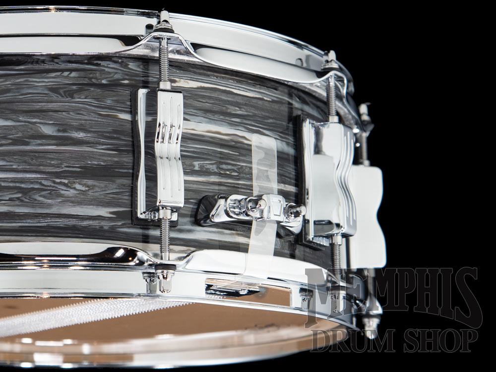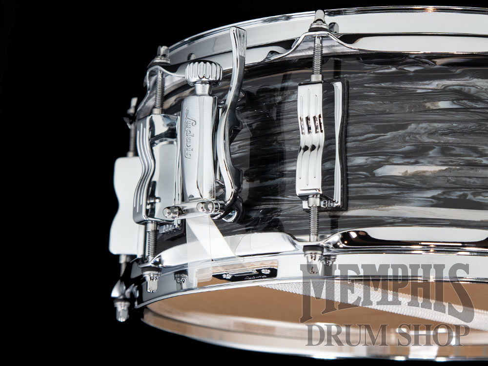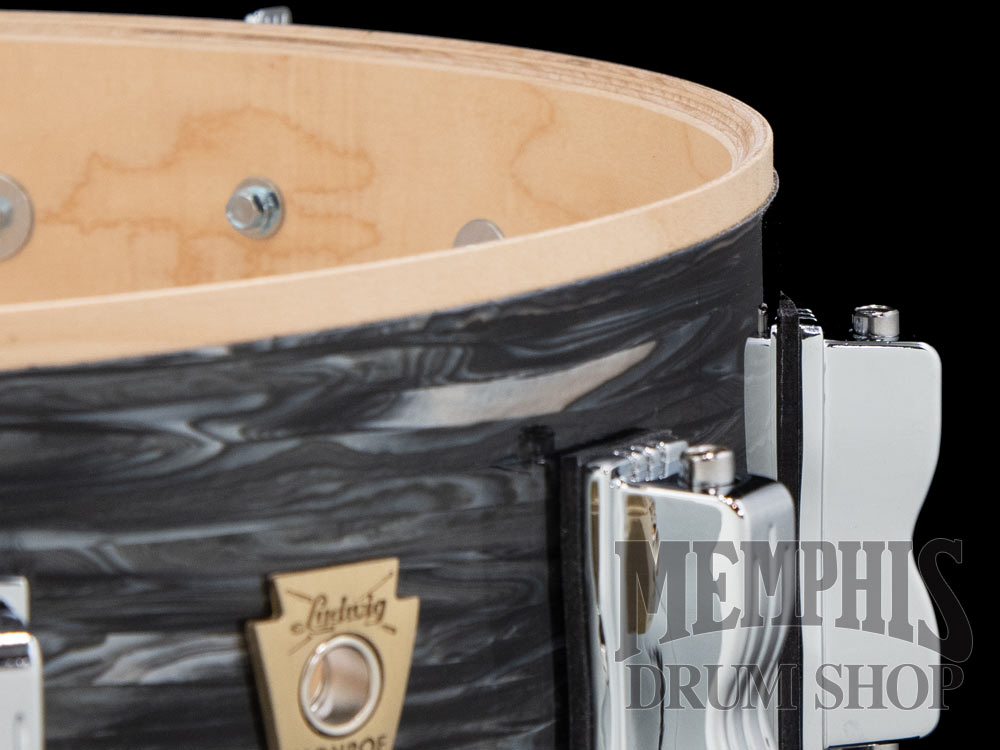 The Ludwig 14x5 Classic Maple Snare Drum (LS401XX1Q) has a 7-ply Maple Shell. This Ludwig snare drum has 45-degree bearing edges, triple-flanged hoops, P88AC throw-off, 10 bowtie lugs, 20-strand snare wires, and a Ludwig Medium Batter Drumhead. This snare drum has a Vintage Black Oyster Pearl finish, chrome hardware, and a GC Brass Cast Badge.
