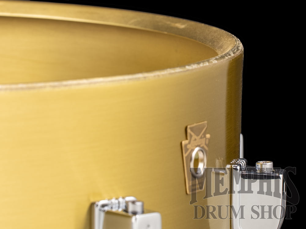 The Ludwig 14x6.5 Acro Brass Snare Drum (LB654BM) features a seamless beaded 1mm brass shell with rolled 45 degree bearing edges, 10 double-ended Twin/Bowtie lugs, 2.3mm steel triple-flange hoops, P86C throw-off, P35 butt plate, Ludwig 18-strand snare wires, Remo Coated Ambassador batter drumhead with Ludwig USA logo, Remo Hazy Ambassador snare side drumhead with Ludwig USA logo, brushed brass finish, chrome hardware, and Ludwig Keystone badge.