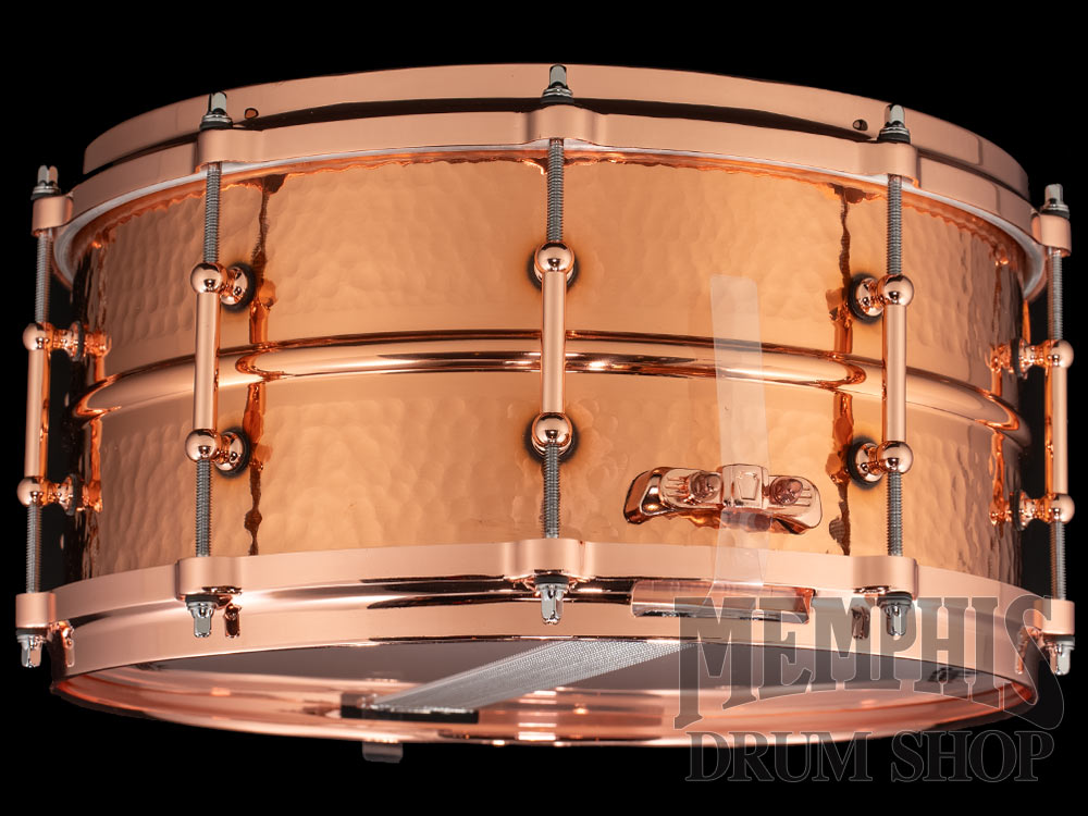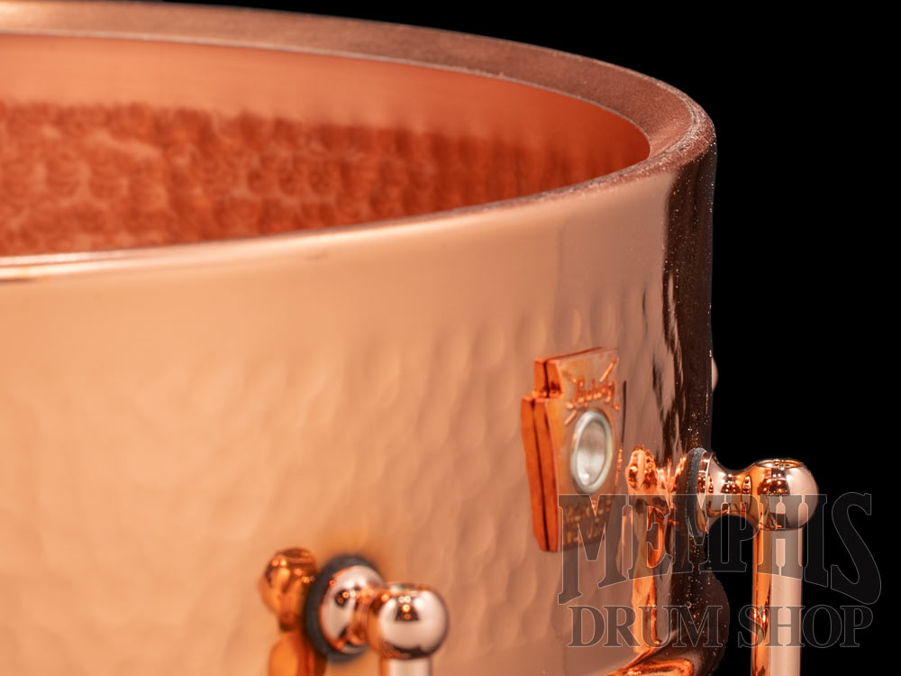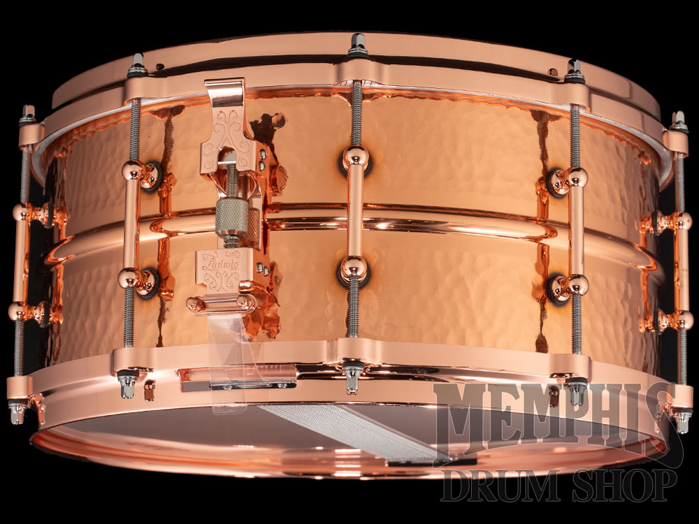 The Ludwig 14x6.5 Copperphonic Hammered Snare Drum (LC662KTC) features a seamless, beaded, hammered 1.2mm copper shell with 45 degree bearing edges, 10 double-ended tube lugs, die-cast hoops, P86 throw-off, P35 butt plate, Ludwig 18-strand snare wires, Remo Coated Ambassador batter drumhead with Ludwig logo, Remo Hazy Ambassador snare side drumhead with Ludwig logo, a smooth hammered copper finish, copper hardware, and Ludwig Keystone badge.