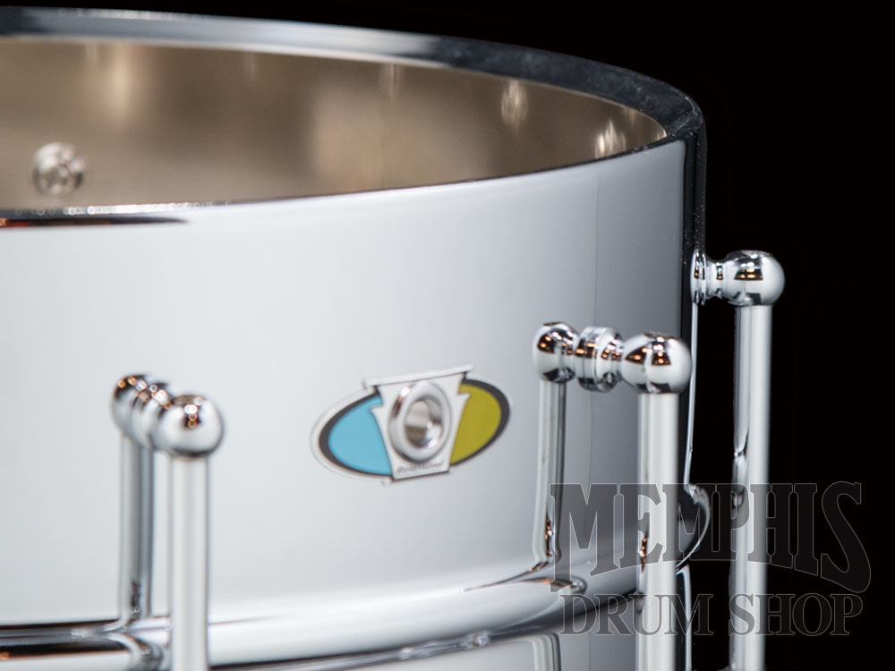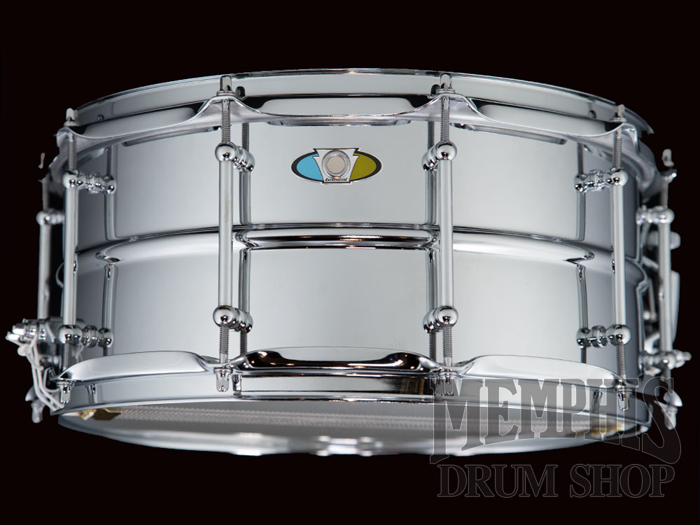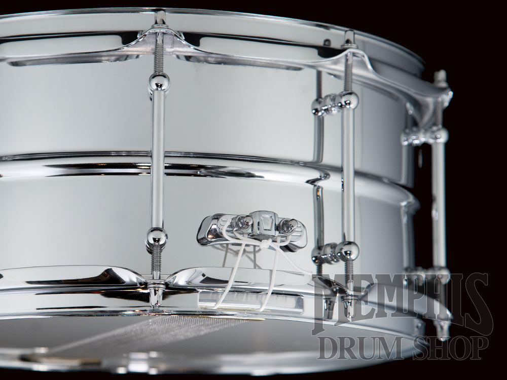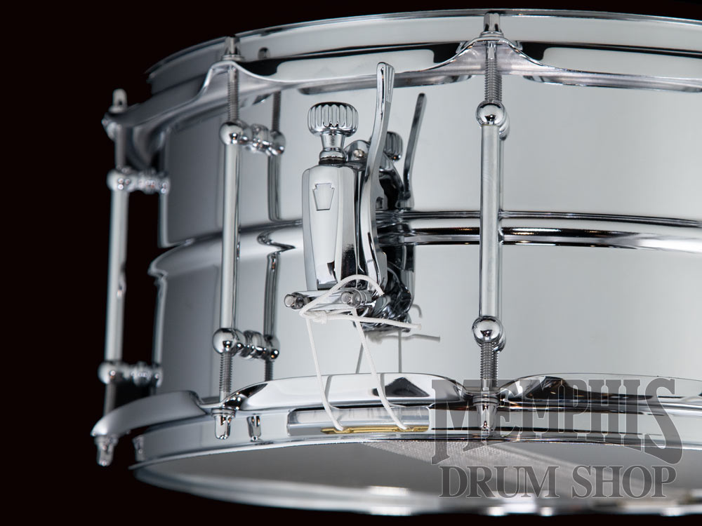 The Ludwig 14x6.5 Supralite Snare Drum (LU6514SL) features a 1mm Beaded Steel Shell, 10 Brass Tube Lugs, 2.3mm Triple Flange Hoops, P88I Throw-off, P33 Butt-plate, and Coated Drumhead. This snare drum has a mirrored, polished finish, Chrome Hardware, and Ludwig Supralite Badge.