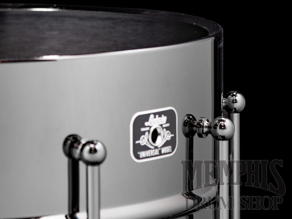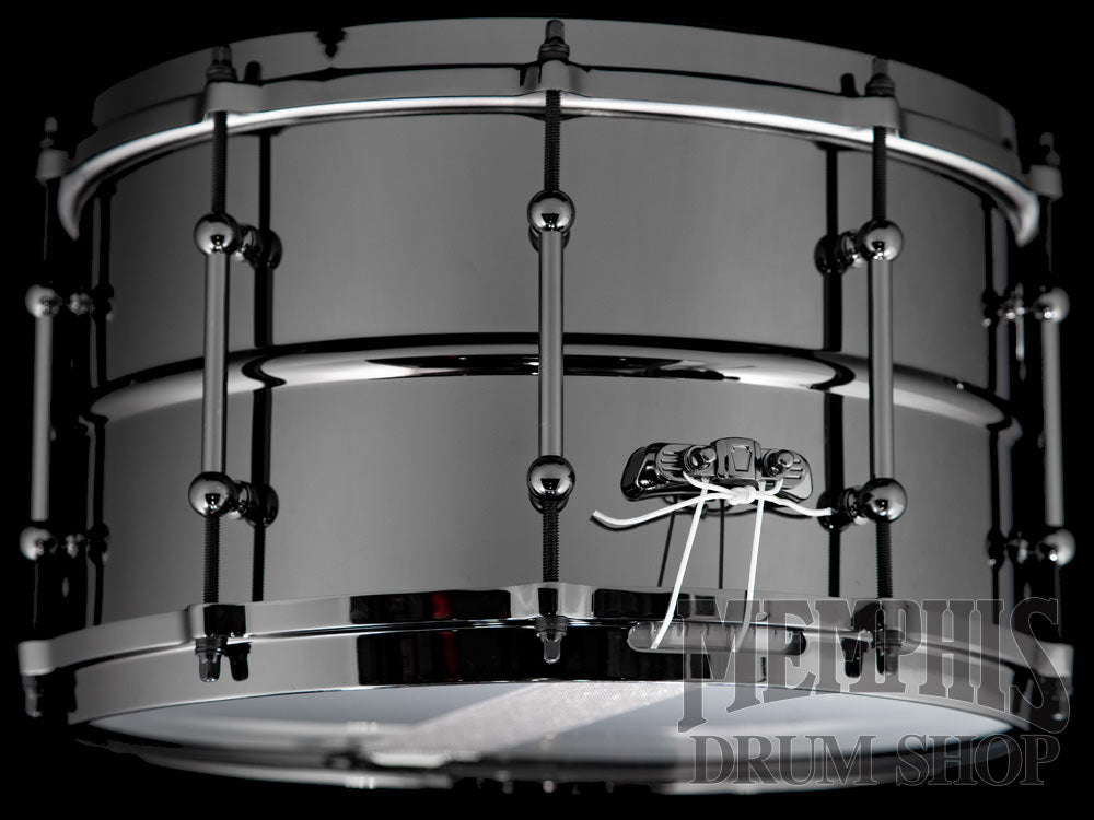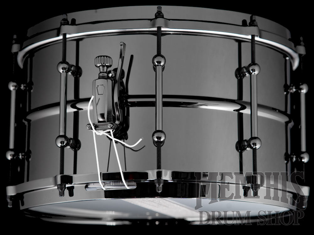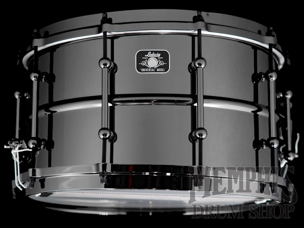 The Ludwig 14x8 Universal Black Brass Snare Drum with Black Hardware (LU0814) features a 1mm Beaded Black Nickel-Plated Brass Shell, 45 Degree Bearing Edges, 10 Tube Lugs, Die-Cast Hoops, P88I Throw-Off, P35 Butt Plate, 20-Strand Brass Coil Snare Wires, Remo Coated UT Drumhead with Ludwig Logo, Black Nickel Hardware, and Ludwig Universal Model Badge.