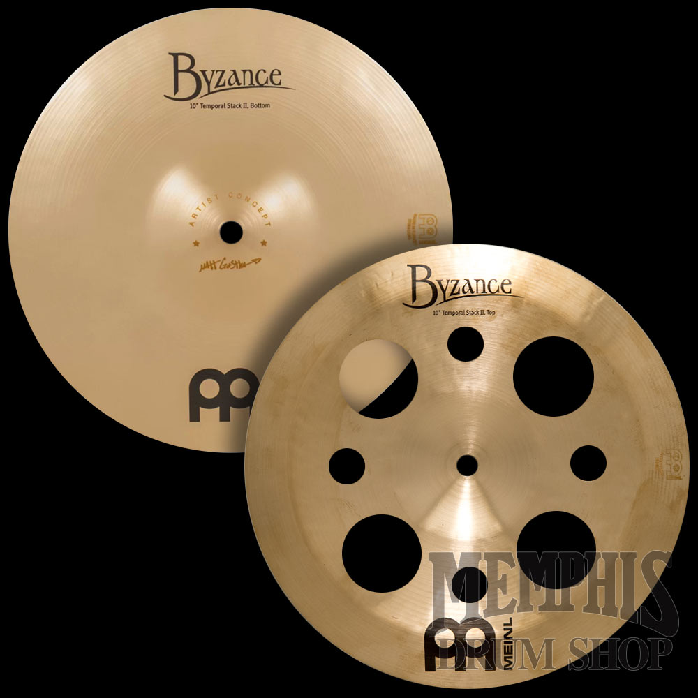 The Meinl 10"/10" Artist Concept Model Temporal Stack II - Matt Garstka has a trashy and dry staccato response that is perfect for rhythmic patterns and accents. Add this stack for a unique voice in your setup or add both and use them together. Higher pitched of the two Matt Garstka Temporal Stacks.