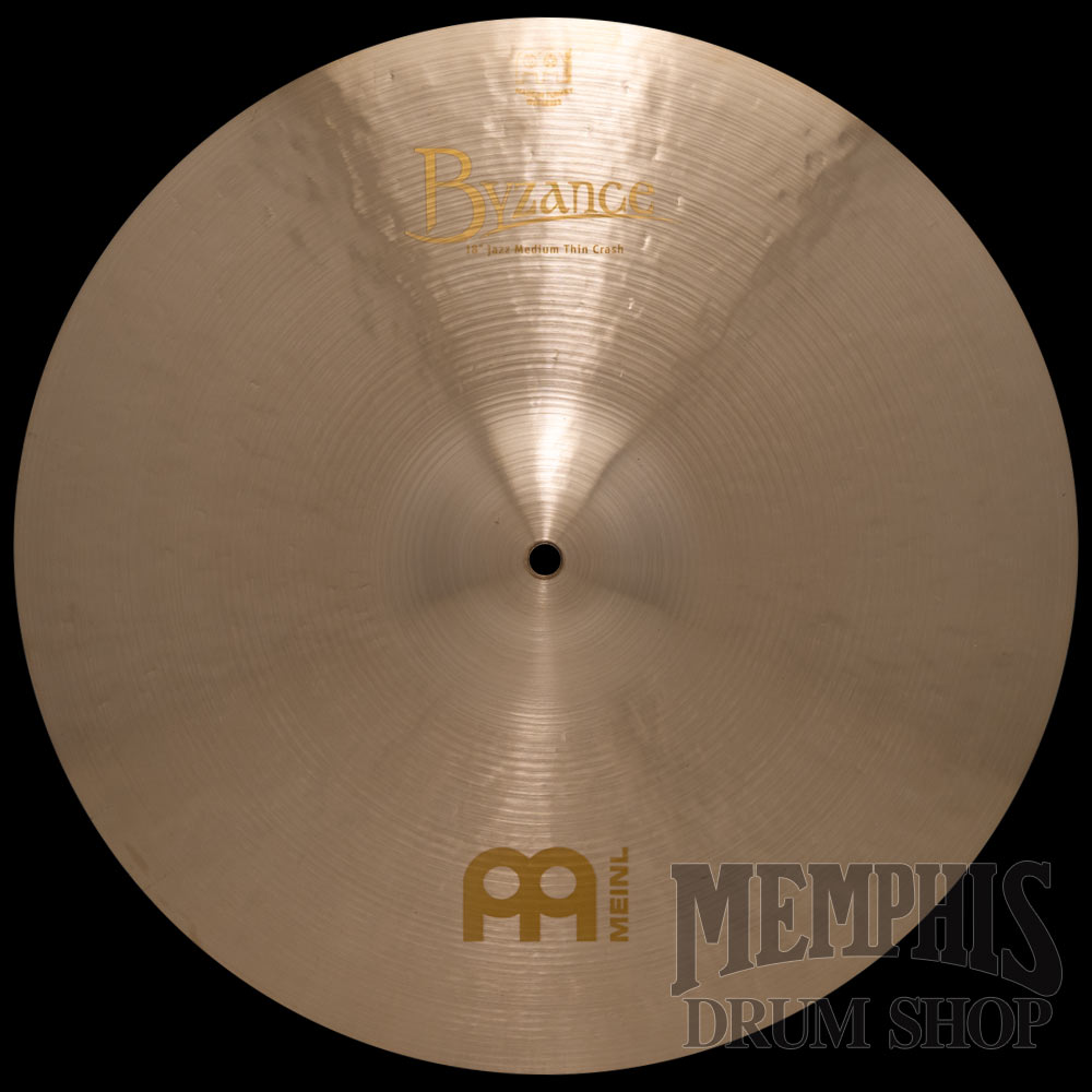 The 18" Meinl Byzance Jazz Medium Thin Crash Cymbal (B18JMTC) is fast and explosive with a warm, dark sound, yet clear projection. Complex frequency range with a fast decay. Suitable as a light ride.