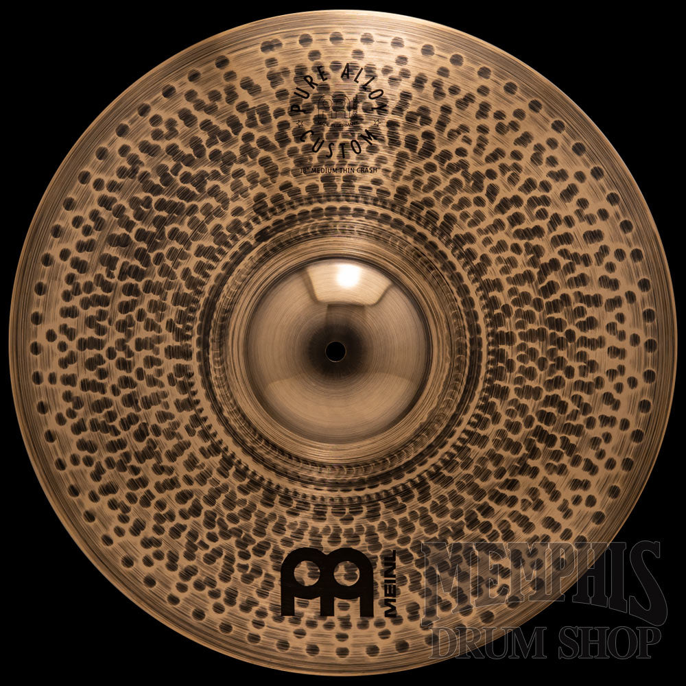 The 18" Meinl Pure Alloy Custom Medium Thin Crash Cymbal Features a custom smoked-bronze top and brilliant bottom, Pure Alloy Custom crashes are slightly warmer with a bright cut and shimmering response. These crashes have a faster decay due to their medium-thin weight.