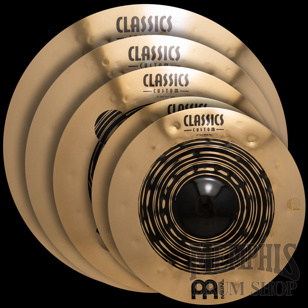 The Meinl Classics Custom Dual Expanded Cymbal Set features 14“ hihats (CC14DUH), 16“ trash crash (CC16DUTRC), 18“ crash (CC18DUC), and 20“ ride (CC20DUR)