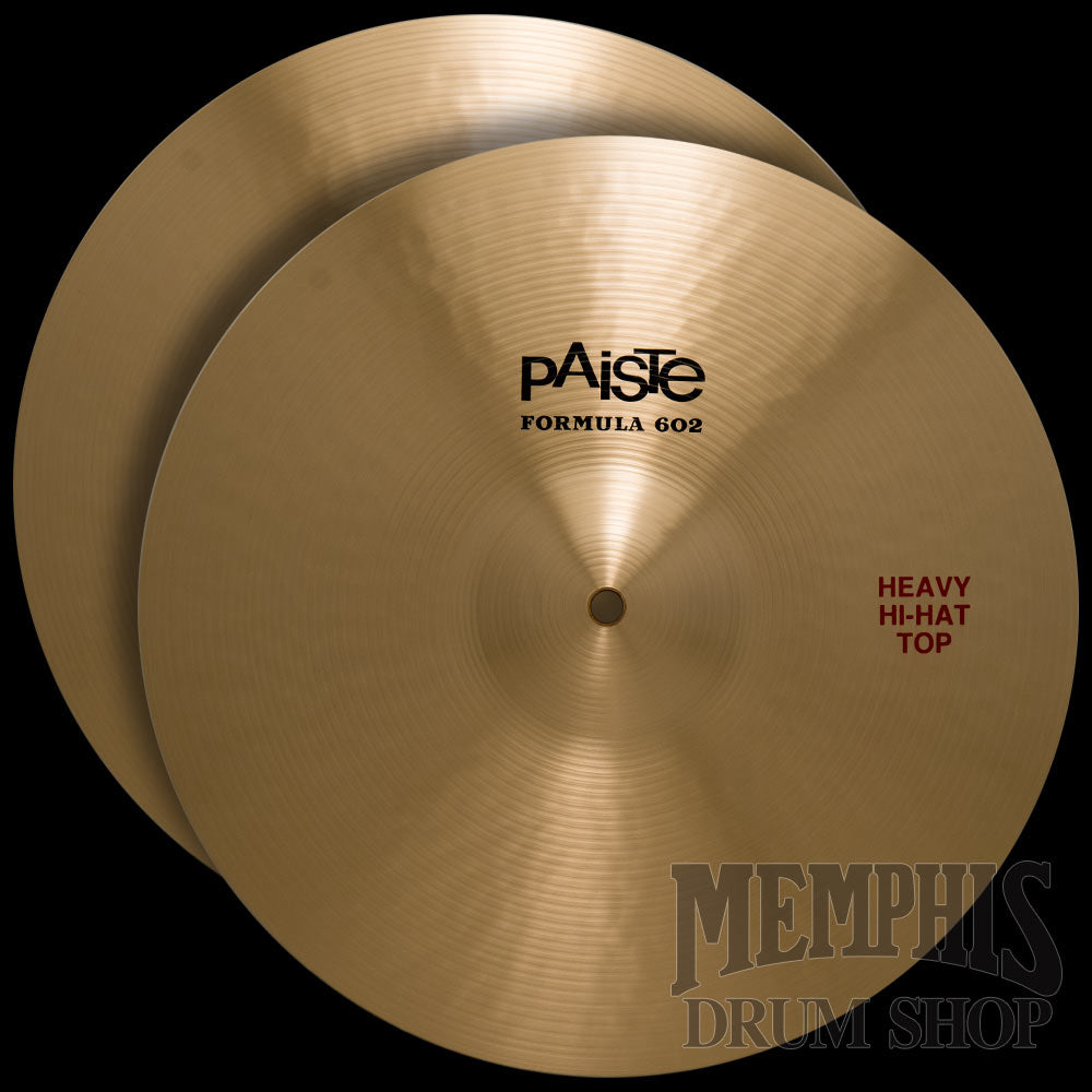 The 14" Paiste Formula 602 Heavy Hi-Hats (1043414) are bright, powerful, crisp. Fairly narrow range, clean mix. Heavy feel. Bright, cutting open sound, clear, defined closed sound. Crisp chick sound. Bright hi-hat with a wide range for articulate playing in medium loud settings to cutting power in very loud situations.