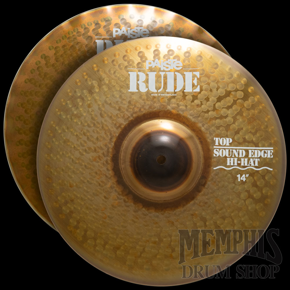 The 14" Paiste Rude Sound Edge Hi Hat Cymbals are very bright, raw, full, and energetic. Fairly wide range, fairly complex mix. Heavy, controllable feel. Full, dirty, loud open sound. Sharp, cutting, strong chick sound. The sound edge for heavy players.