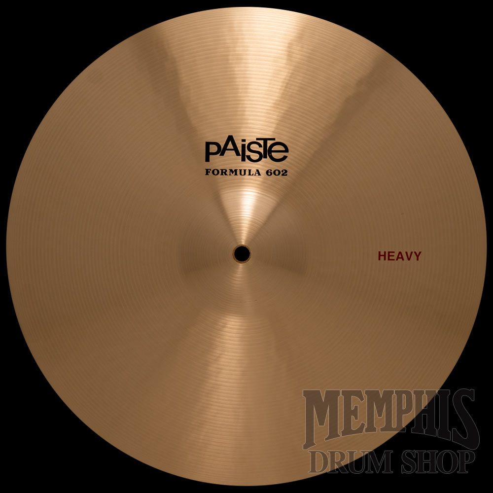 The 16" Paiste Formula 602 Heavy Crash Cymbal is bright, powerful, solid, clear. Medium wide range, clean mix. Heavy feel. Powerful, explosive attack. Multifunctional cymbal with solid, assertive crash and bright, clear ping.