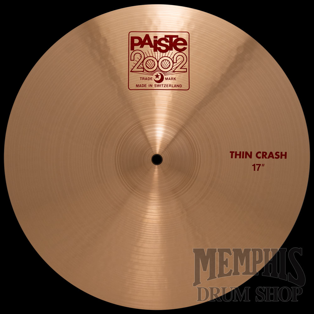 The 17'' Paiste 2002 Thin Crash Cymbal is medium bright, full, silvery, and breathy. Wide range, slightly complex, dense mix. Soft, giving, very responsive feel. A sturdy thin crash with a rich, cutting character. Perfect for patterned playing and filling sound spaces in minimal instrumentation.