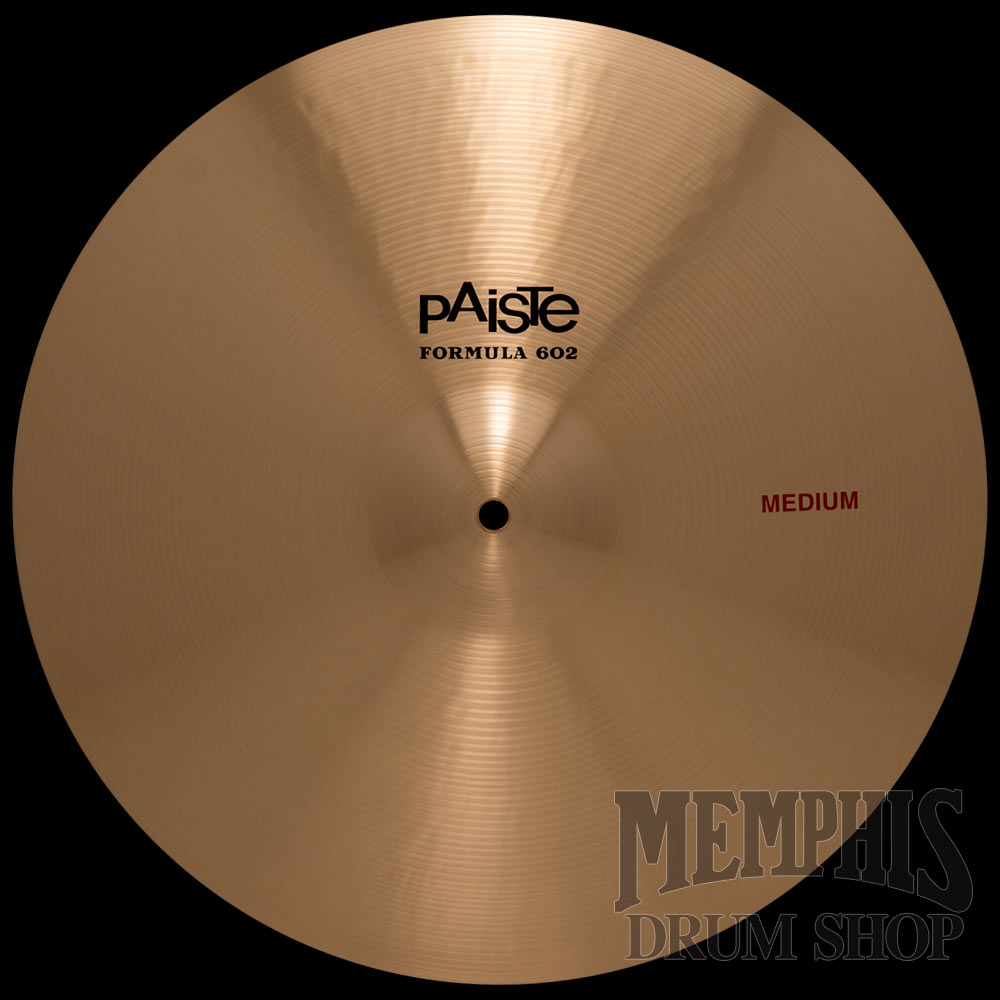 The 17" Paiste Formula 602 Medium Crash Cymbal is fairly bright, full, forceful, clear. Medium wide range, clean mix. Fairly soft feel. Full, explosive attack with quick response. Multifunctional cymbal with full, strong crash sound and very effective, light, silvery ride character.
