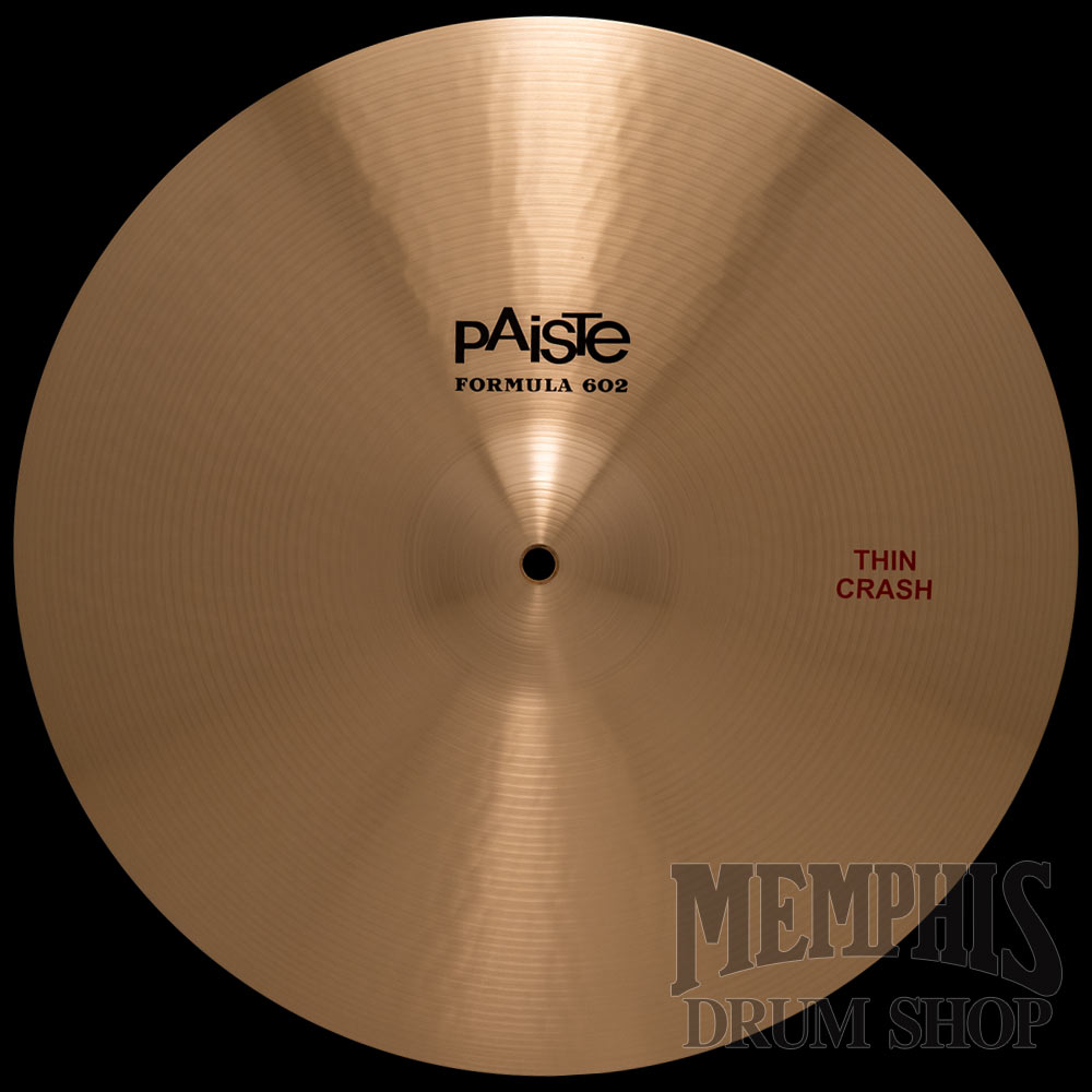 The 17" Paiste Formula 602 Thin Crash Cymbal is silvery, breathy, transparent. Fairly wide range, slightly complex and dense mix. Soft shimmering and velvety feel. A light crash cymbal with a definite retro character suited for many styles in that music genre.