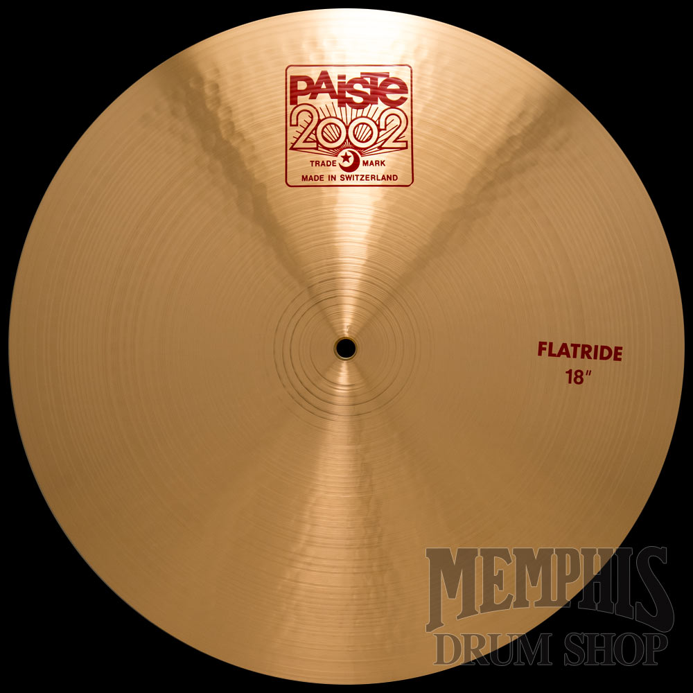 The Paiste 18" 2002 Flat Ride Cymbal (1062318) is fairly bright, warm, sweet. Fairly narrow range, clean mix. Soft, responsive feel, very controllable. Silvery pearling ping over warm, controlled wash. A clear, classic flat ride sound with a bit more strength.