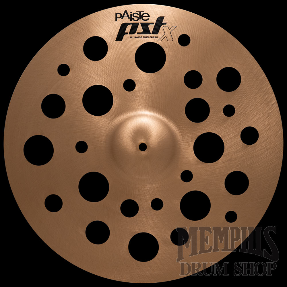 The 18" Paiste PST X Swiss Thin Crash Cymbal (1255218) is exotic, warm, and trashy. Medium range, complex mix. Fast, responsive feel, fairly quick decay. An explosive Crash cymbal with a strong, low wash for unique effects in many styles of music.