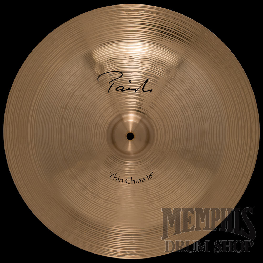 The 18" Paiste Signature Thin China Cymbal has a fairly trashy, bright attack, and a low wash. Wide frequency range, fairly clean mix. Explosive response, fast fade. Size range allows everything from quick accents to complex ride playing.