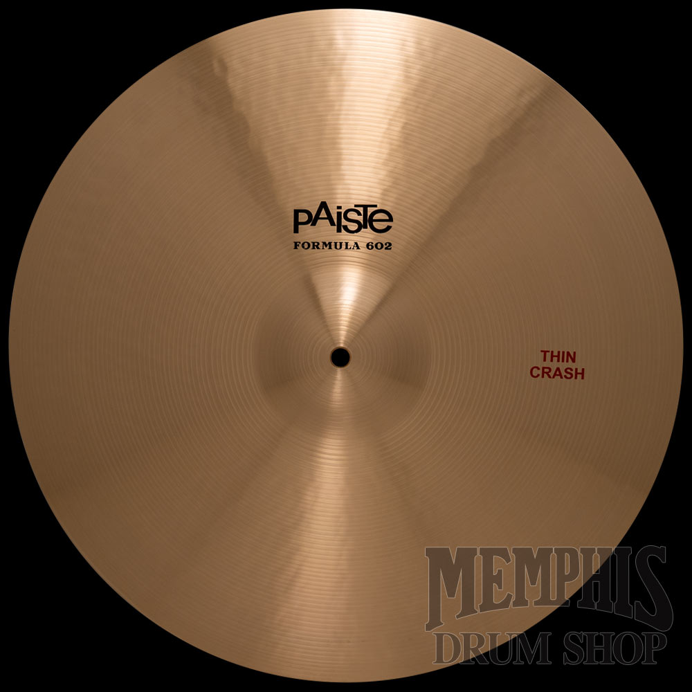 The 19" Paiste Formula 602 Thin Crash Cymbal is silvery, breathy, and transparent. Fairly wide range, slightly complex and dense mix. Soft shimmering and velvety feel. A light crash cymbal with a definite retro character suited for many styles in that music genre.