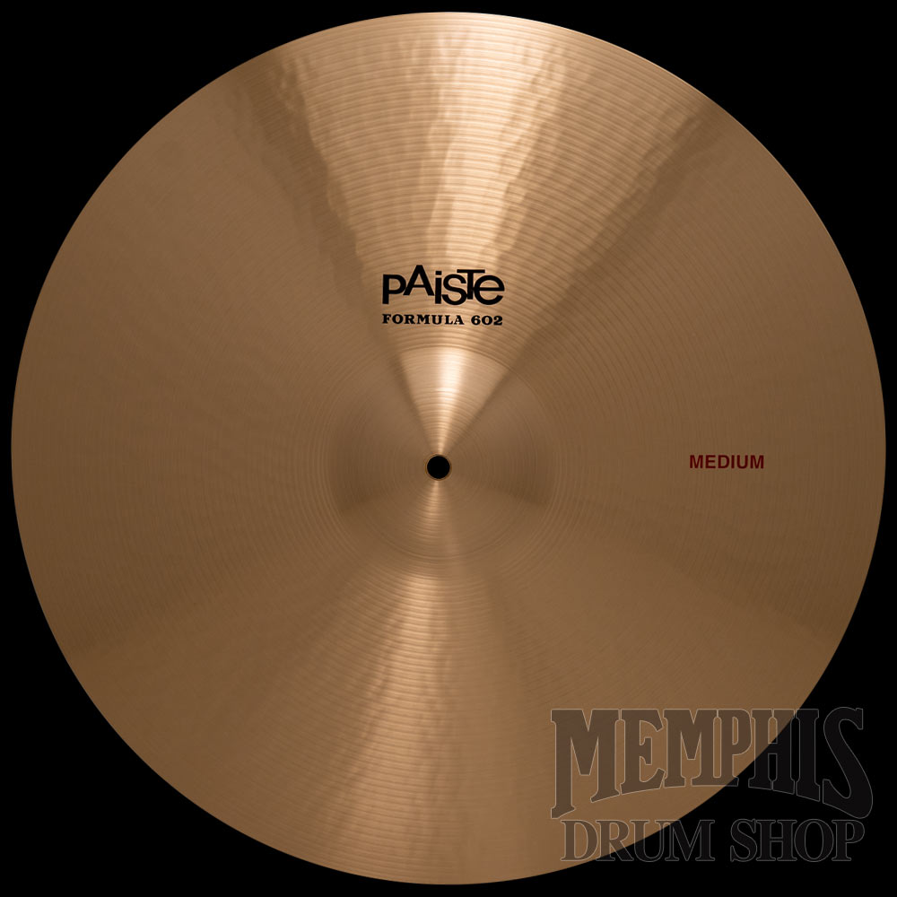 The 20" Paiste Formula 602 Medium Crash Cymbal is fairly bright, full, forceful, clear. Medium wide range, clean mix. Fairly soft feel. Full, explosive attack with quick response. Multifunctional cymbal with full, strong crash sound and very effective, light, silvery ride character.