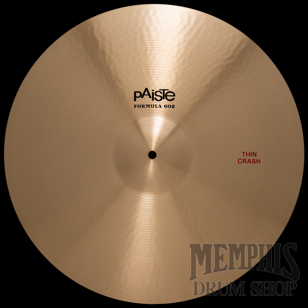 The 20" Paiste Formula 602 Thin Crash Cymbal is silvery, breathy, and transparent. Fairly wide range, slightly complex and dense mix. Soft shimmering and velvety feel. A light crash cymbal with a definite retro character suited for many styles in that music genre.