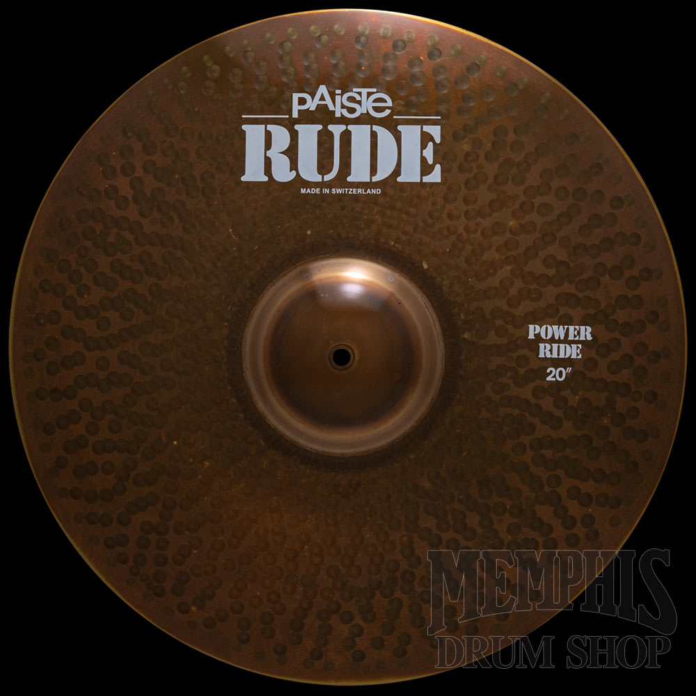 The 20" Paiste Rude Power Ride Cymbal (1122920) is fairly bright, metallic, raw, full, energetic, and cutting. Fairly narrow range, complex mix. Heavy feel, strong, loud ping over controlled, raw, full wash, piercing, loud bell. For extreme ride playing.