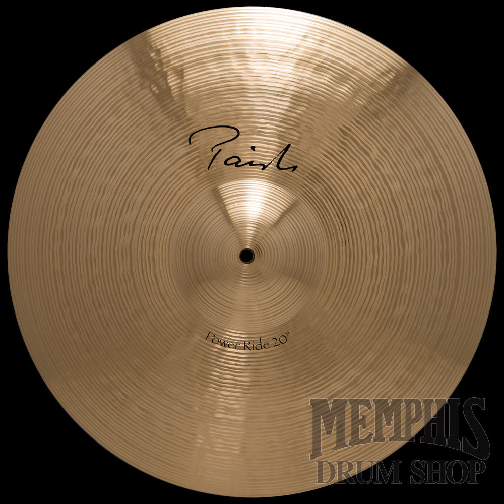 The 20" Paiste Signature Power Ride Cymbal is bright, full, clean, energetic, and strong. Fairly narrow range, fairly clean mix. Heavy response, controllable feel. Big, clean, glassy ping over a dry, dark and bell-like wash. The classic power ride sound for mainly Rock and Metal applications.