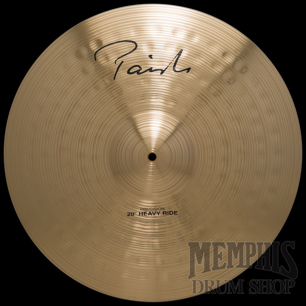 The 20" Paiste Signature Precision Heavy Ride Cymbal is bright, powerful, and brillant. Wide range, clean mix. Heavy feel. Defined, meaty ping with a clear, controllable wash. Piercing bell sound. Strong, heavy ride, well suited for playing at higher volume levels.