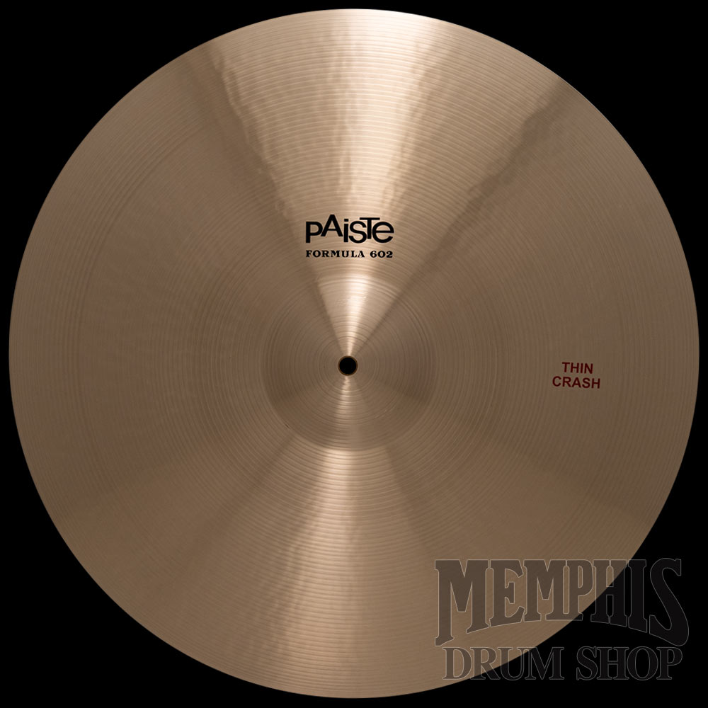 The 22" Paiste Formula 602 Thin Crash Cymbal is silvery, breathy, and transparent. Fairly wide range, slightly complex and dense mix. Soft shimmering and velvety feel. A light crash cymbal with a definite retro character suited for many styles in that music genre.