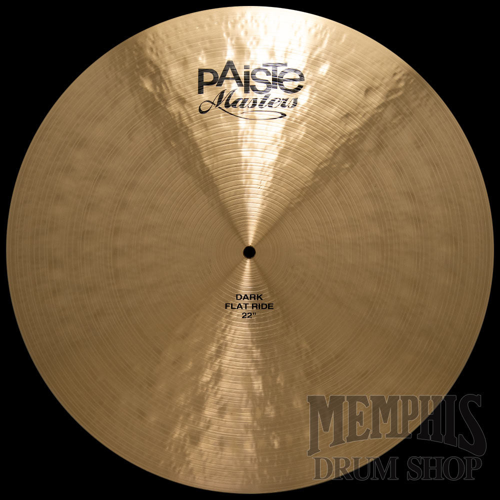 The Paiste 22" Masters Dark Flat Ride Cymbal (5502422) is dark, smoky, warm, mellow. Fairly narrow range, complex mix. Soft, responsive feel, controllable. Warm, articulate ping with dark, smoky, slightly trashy wash. Well suited for fast, subtle playing in soft to medium loud situations.