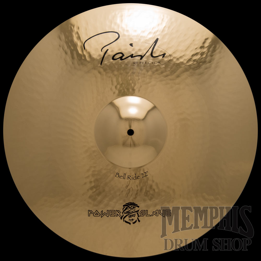 The 22" Paiste Signature Reflector Bell Ride Powerslave Cymbal (4055622) is fairly dark, full, controlled, glassy, and shimmering. Fairly wide range, clean mix. Very comfortable feel with a clear, full ping over a large, deep harmonic wash. This ride cymbal is extremely well suited for intricate stick work that calls for a strong bell in all types of Rock based music. Developed in co-operation with the legendary Iron Maiden drummer Nicko McBrain. This cymbal features a custom "Powerslave" logo in a Iron Maiden style font.