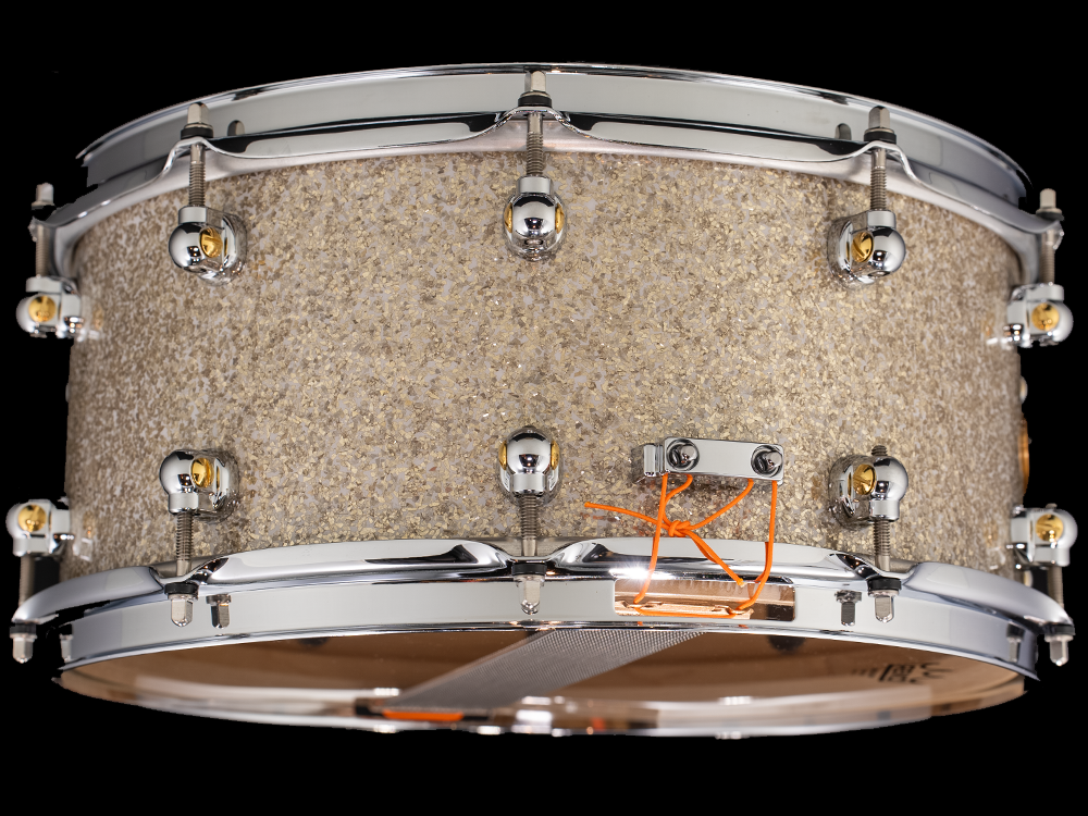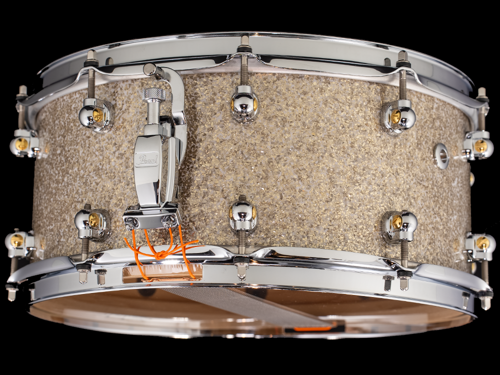 The Pearl 14x6.5 Music City Custom Solid Maple Snare Drum - Diamond Glitter (MCCM1465S-C409) features an 8mm solid maple shell with 6mm solid maple reinforcement hoops, 45-degree bearing edges, 20 single-ended STL100 Swivel Lugs in a 10-lug configuration, 2.3mm triple-flanged Pearl SuperHoop II Hoops, SR017 snare strainer, 20-strand Ultrasound Type "I" snare wires, Remo Coated Ambassador batter drumhead, Remo Clear Ambassador snare side drumhead, a Diamond Glitter wrap finish, chrome hardware, and Pearl Music City Custom badge. This is a unique snare drum, born from collaboration between Pearl Drums and Memphis Drum Shop! This snare has all the iconic tone of a Pearl Music City Custom Solid Shell Snare Drum, but with the look and protection of a wrap finish which is typically not offered for Music City Custom Solid Snare Drums. An expertly crafted snare drum at an excellent price point!