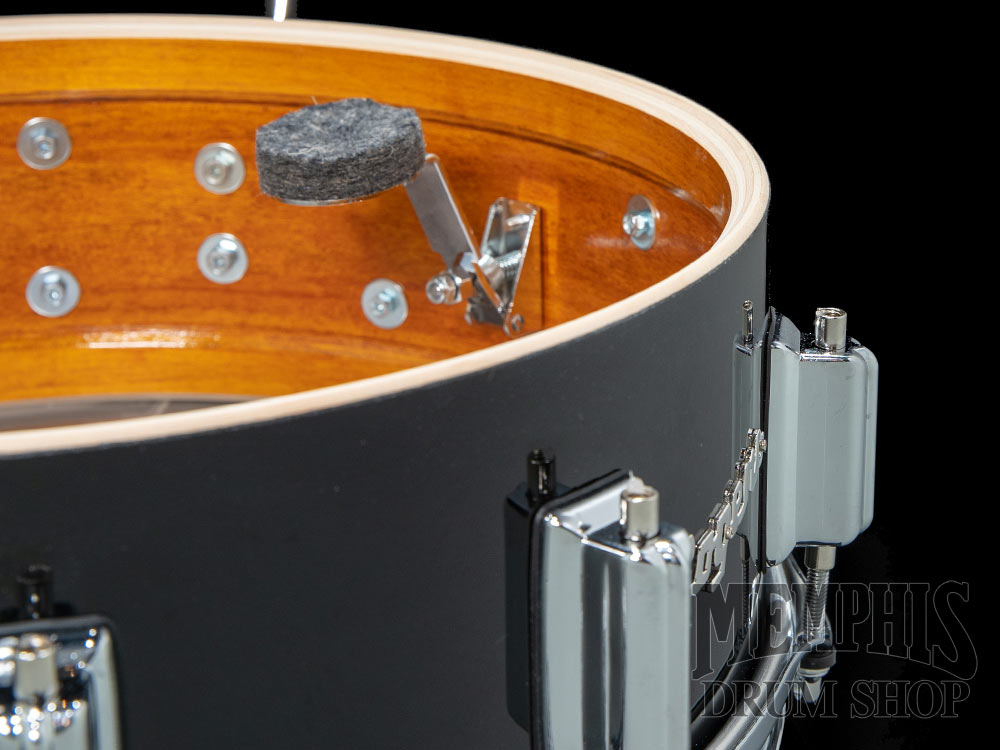 The Rogers 14x5 Dyna-Sonic Snare Drum has a 5-Ply maple shell with maple reinforcement hoops. This Rogers Snare Drum has a triple-flanged hoop with snare gates, 10 Beavertail lugs, 45-degree bearing edges, Rogers Clock Face throw-off, Rogers Patented choke-free floating snare rail system with 20-strand snare wires, internal tone control, and an ambassador drumhead by Remo with the Rogers logo. This Snare Drum has a Black Gloss Lacquer finish, fruitwood stain interior, oval Rogers Dyna-Sonic badge, and chrome hardware.