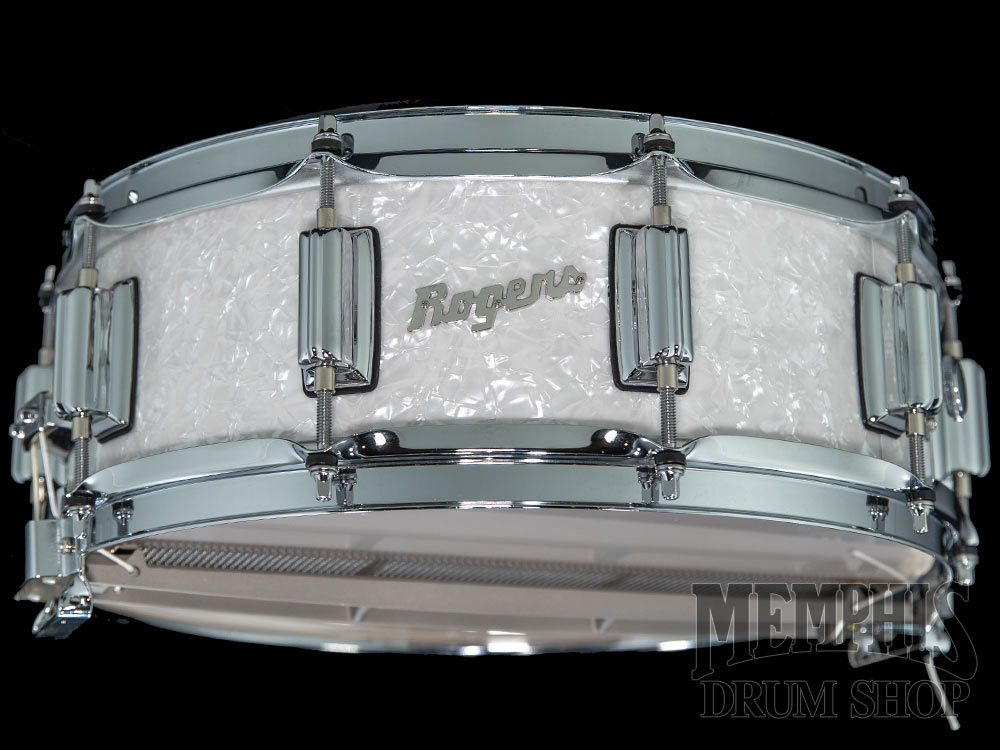 The Rogers 14x5 Dyna-Sonic Snare Drum (36WMP) has a 5-Ply maple shell with maple reinforcement hoops. This Rogers Snare Drum has a triple-flanged hoop with snare gates, 10 Beavertail lugs, 45-degree bearing edges, Rogers Clock Face throw-off, Rogers Patented choke-free floating snare rail system with 20-strand snare wires, internal tone control, and an ambassador drumhead by Remo with the Rogers logo. This Snare Drum has a White Marine Pearl finish, fruitwood stain interior, oval Rogers Dyna-Sonic badge, and chrome hardware.
