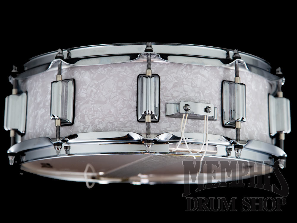 The Rogers 14x5 SuperTen Snare Drum White Marine Pearl (ST36WMP) features a Maple/Poplar shell with 2-ply reinforcement rings, 10 Beavertail die-cast lugs, 2.3mm triple-flanged hoops, Rogers Clock Face throw-off, 20-strand snare wires, internal tone control, Remo USA batter/UT snare side drumheads, white marine pearl wrap finish, Fruitwood stain interior, chrome hardware, and Rogers SuperTen badge.
