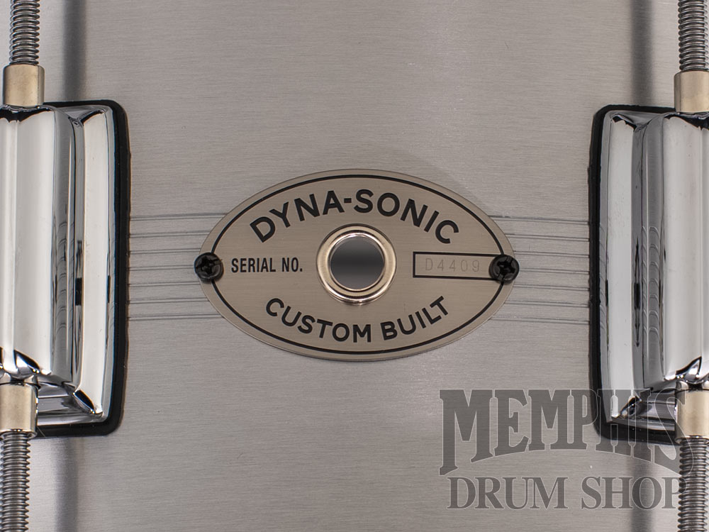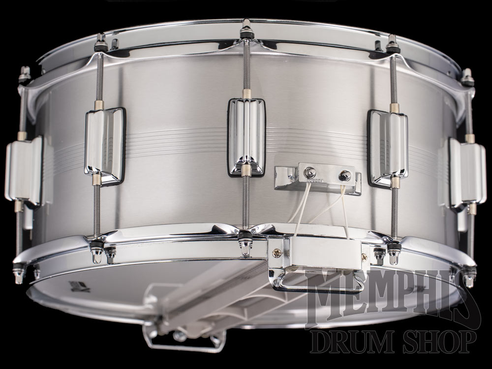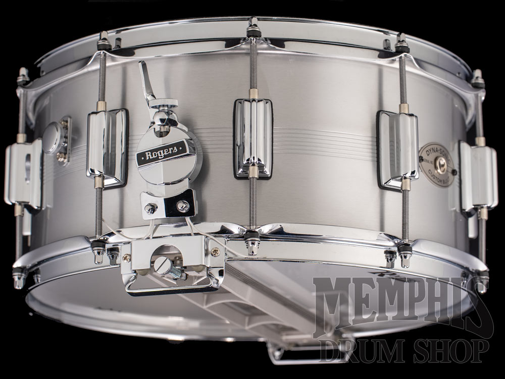The Rogers 14x6.5 Dyna-Sonic 7-Line Aluminum Snare Drum (37AL) features a Rogers proprietary 7-line Aluminum Shell with 45-Degree Flanged Bearing Edges, 10 Die-Cast Beavertail Lugs, 1.6mm Triple-Flange Hoops, Snare Side Gates, Clock-Face Throw-Off and Matching Butt Plate, Dyna-Sonic Patented Floating Rail System, 20-Strand Snare Wires, Rogers logo Remo Coated Ambassador Batter Drumhead, Rogers logo Remo Hazy Ambassador Snare Side Drumhead, Satin Aluminum Finish, Chrome Hardware, and Rogers Script Logo and Dyna-Sonic Badges.