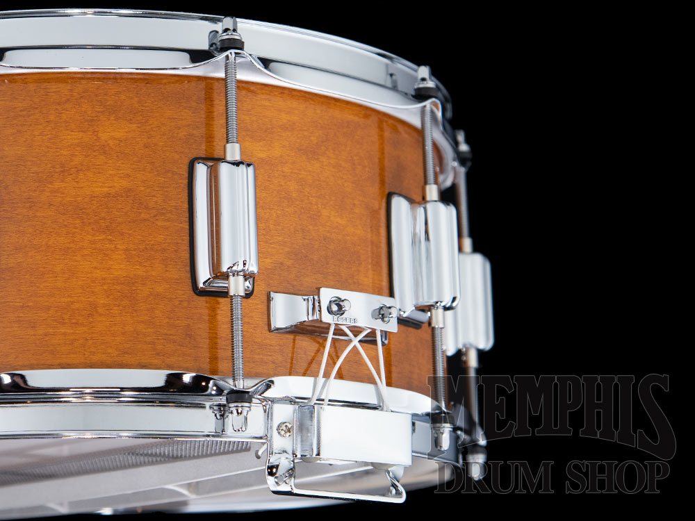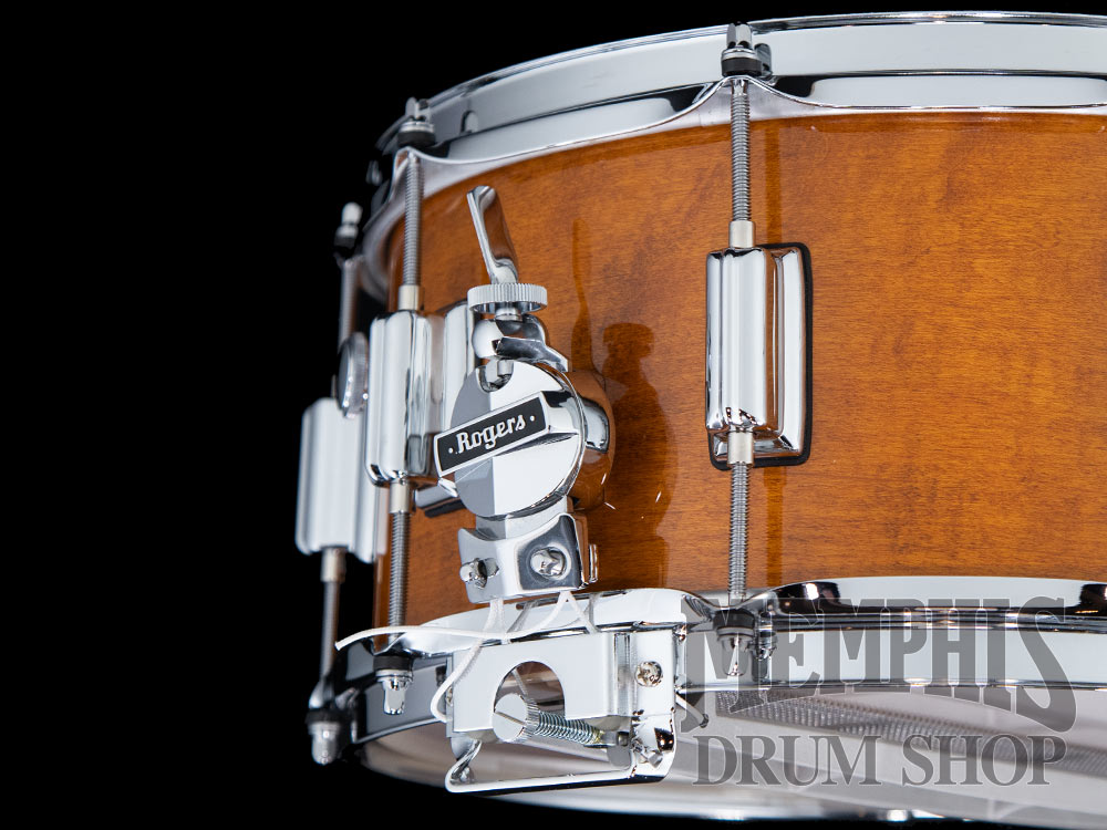 The 14x6.5 Rogers Dyna-Sonic Snare Drum with Beavertail Lugs has a 5-ply maple shell with maple reinforcement hoops. This Rogers snare drum features 45-degree bearing edges, triple-flanged hoops, 10 beavertail lugs, Rogers Clockface throw-off and butt-plate combination, 20-strand snare wires, floating snare rail, and Remo coated Ambassador. This snare drum has a Fruitwood Stain finish, Rogers badge, Vented Dyna-Sonic badge, and chrome hardware. The Rogers Dyna-Sonic LTD Custom Snare Drums are a collection of special-build custom snare drums that will be produced in single and limited production runs, highlighting the finest in select woodgrains and exceptional shell finish treatments.