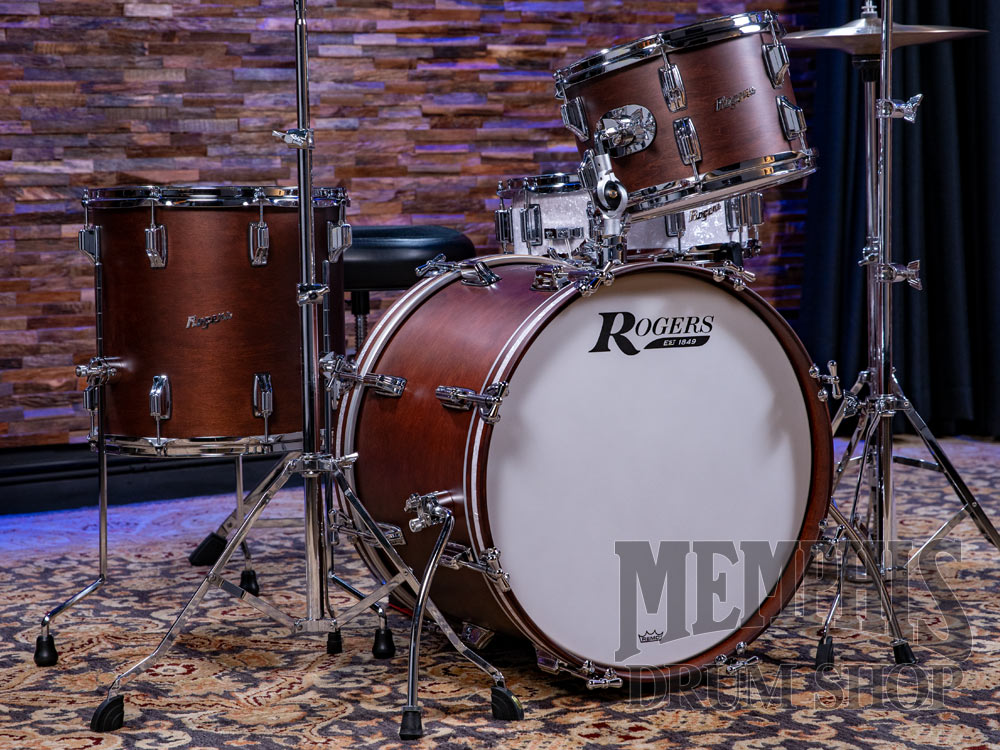 The Rogers Cleveland Drum Set 20/12/14 Satin Dark Mahogany (CLE0320HXDM) features 5-ply maple/poplar shells with 2-ply maple reinforcement rings, 45 degree with reverse roundover bearing edges, 2.3mm triple-flanged hoops, Beavertail die-cast lugs, Rogers Ultra-Matic tom arm, Hex profile floor tom legs, Satin Dark Mahogany finish, chrome hardware, Remo Coated Ambassador drumheads with Rogers logo, and Rogers Script Logo badge.