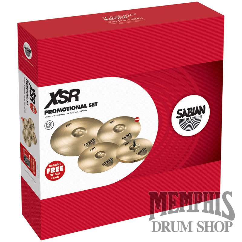The Sabian XSR Performance Cymbal Box Set includes: 14" Hi Hats, 16" Fast Crash, 20" Ride Cymbal and a free 18" Fast Crash.