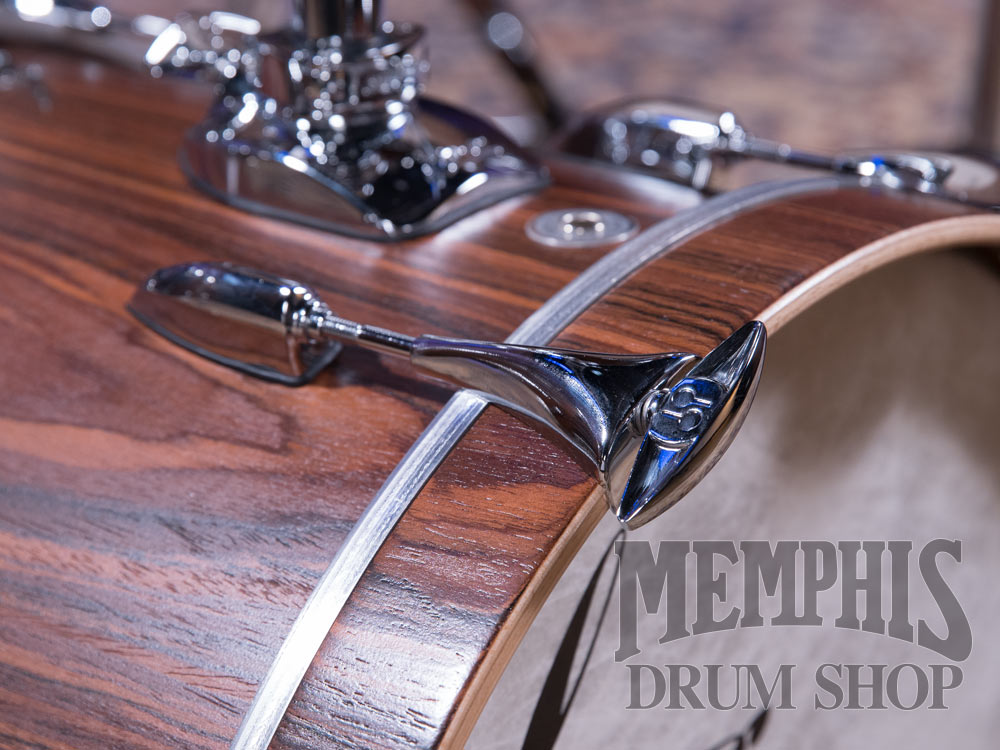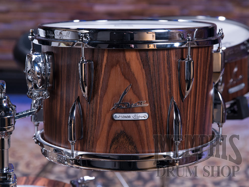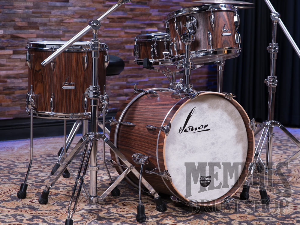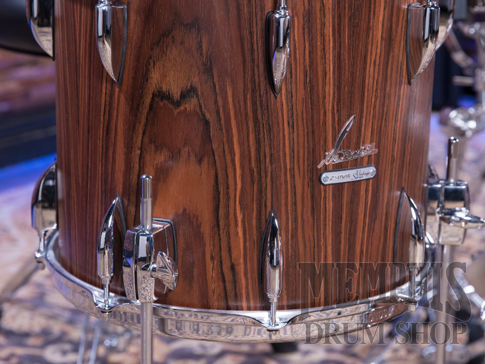 The Sonor Vintage Series Drum Set 18/12/14 (VT-318WMCRSG) features 9-ply German Beech Shells, Rounded 30 Degree Bearing Edges, Tear Drop Lugs with Tune Safe System, Sonor Super Profil Hoops, and Sonor Coated White Medium Weight Drumhead by Remo. This drum set has a Rosewood Semi Gloss finish, Chrome Hardware, and includes a STHVT674MC Single Tom Holder.