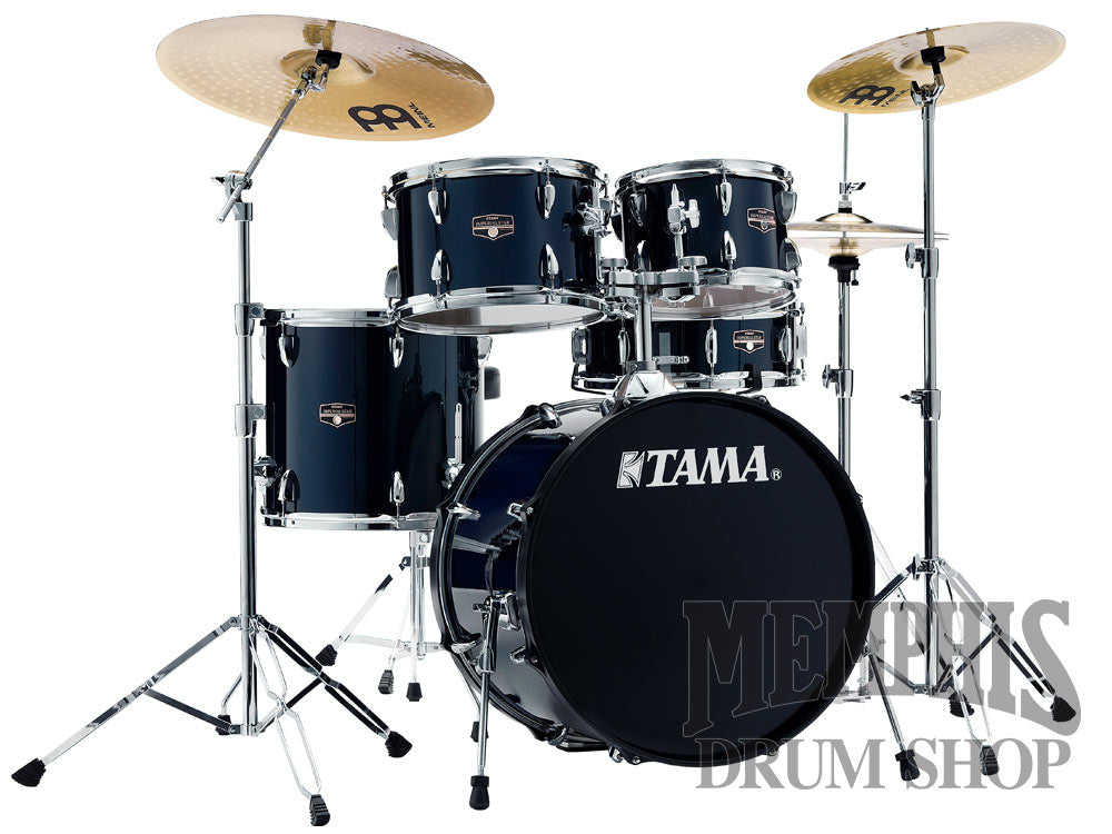 The Tama Imperialstar Complete Drum Set (IE50CDB) features 6-ply 100% poplar shells with Tama Precision bearing edges, triple-flanged hoops, dark blue finish, and chrome hardware. Hardware included: double tom holder (MTH50), hi-hat stand, single drum pedal, snare stand, boom cymbal stand, straight cymbal stand. Cymbals included: Meinl HCS 14” Hi-Hats, 16” Crash, and 20” Ride.