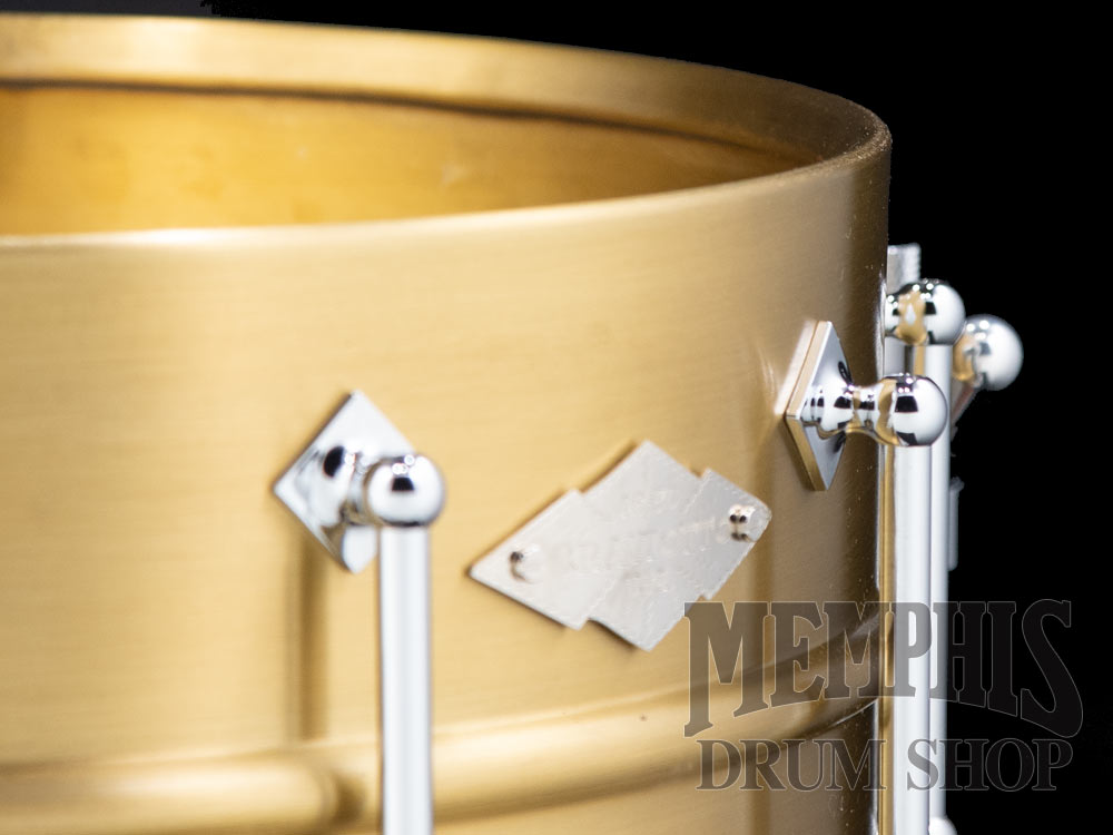 This Used Craviotto 14x6.5 Masters Metal AK Brass Snare Drum features a 1mm brass shell, 45 degree bearing edges, 10 tube lugs, Trick GS007 throw off, 25-strand snare wires, chrome hardware, Craviotto Coated Drumhead by Aquarian, and an engraved Craviotto badge. This snare drum is labeled as #45 of 60. No case included.