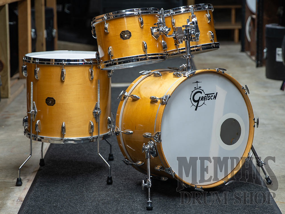 The Used Gretsch 80s Maple Drum Set 22/12/13/18 - Natural Satin (UG4PC22121318-NS) is a vintage player grade mixed badge drum set consisting of different 80s Gretsch 6-ply maple drums in matching natural satin finishes. 80s Gretsch drums are known for being built with unmatched quality craftsmanship, and possessing outstanding tonal capabilities. This drum set is no exception!